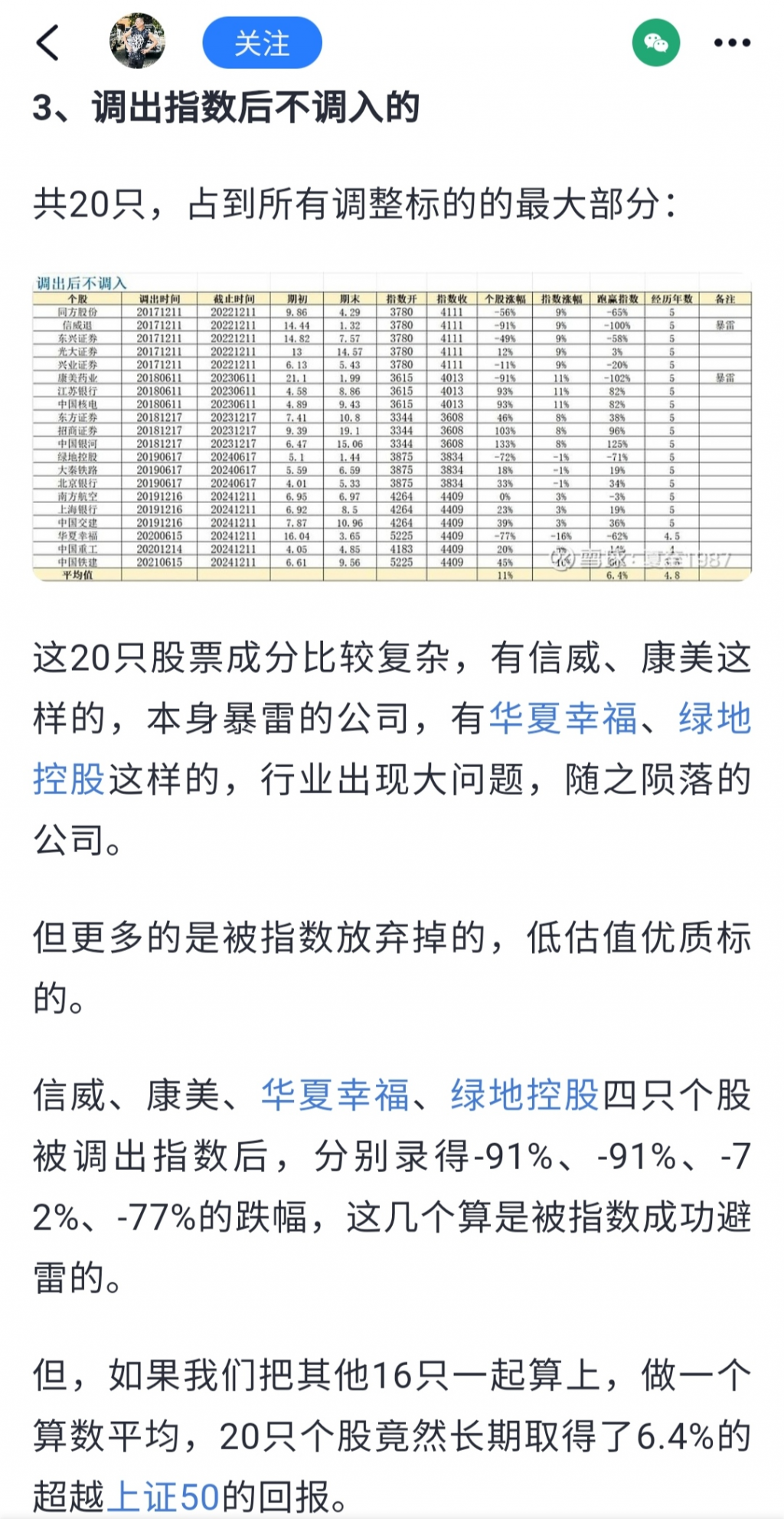 原来雪球上早就有人统计了,上证50指数确实不太行,被调出的成分股总体是跑赢指数的。