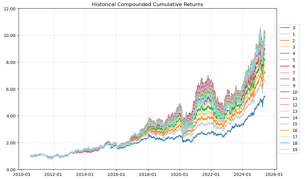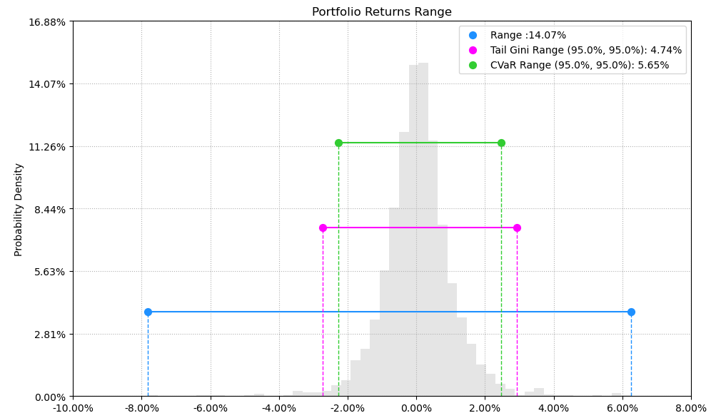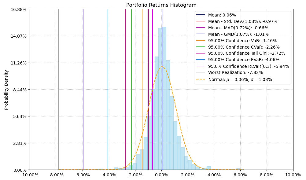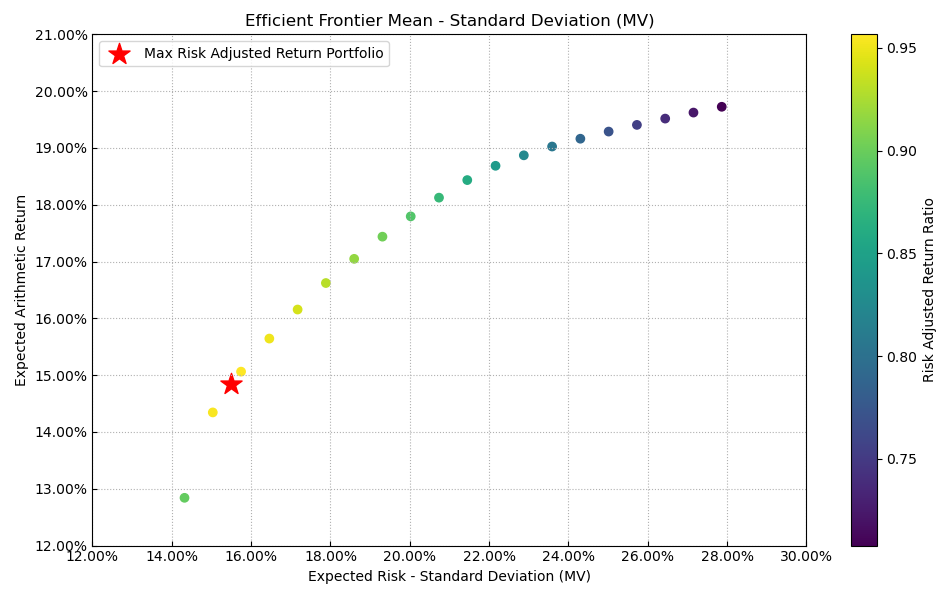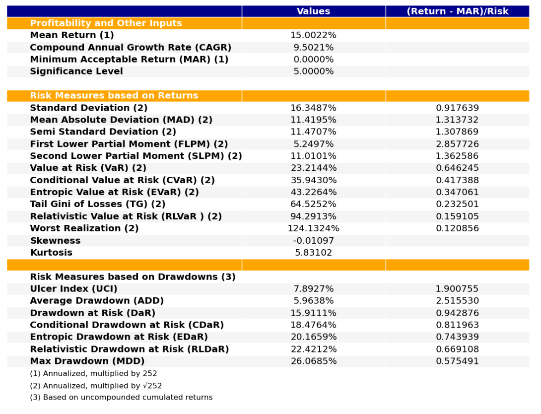 最后看下整个投资组合的情况,日度均值回报在0.06%,比上次测的特种化工行业低40%,不过5.65%的CVaR波动也会小很多。(注:均值回报看Mean那一栏,越高越好;CVaR波动看CVaR那一栏,越低越好)
