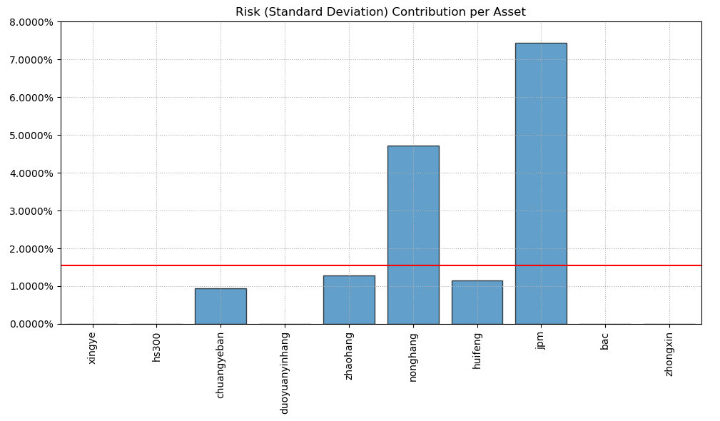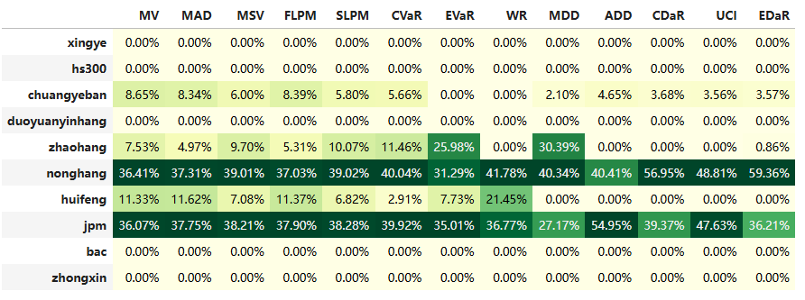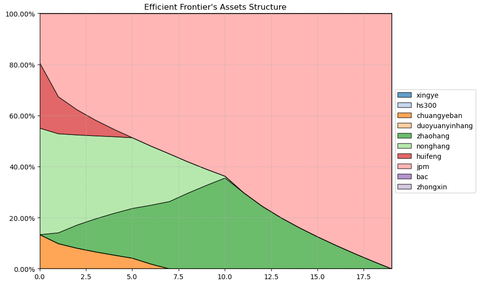如果换成其他约束,系统给的配置比例也大同小异,基本是在农业银行和美股的摩根大通之间做取舍了。(注:占比越高越好)