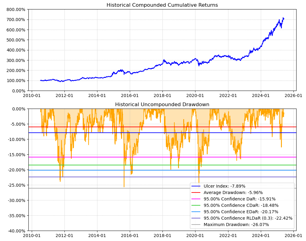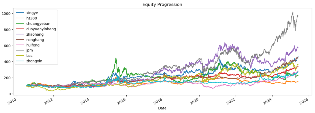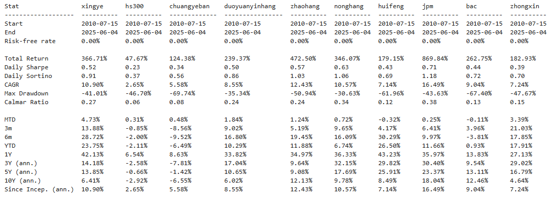 区间累计回报近8倍,最大回撤26.07%,投资组合的整体表现要好于兴业银行个股。整个多元银行行业盈利能力一般,波动低,夏普比率0.96中规中矩。(注:累计回报看Cumulative Returns那一栏,越高越好;最大回撤看Maximum Drawdown那一栏,越低越好)