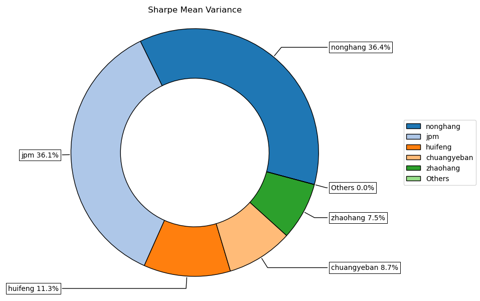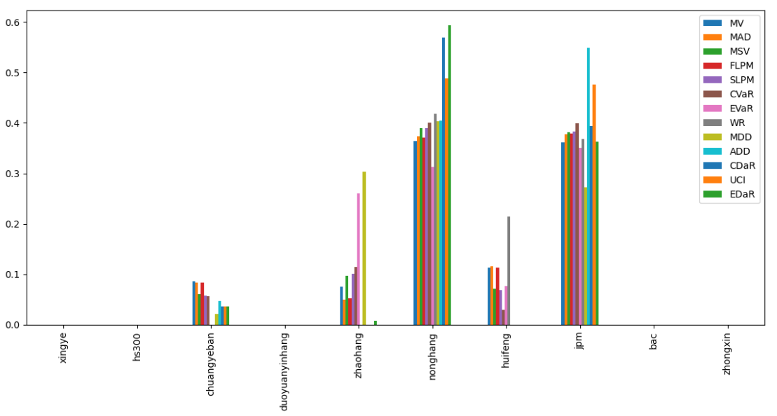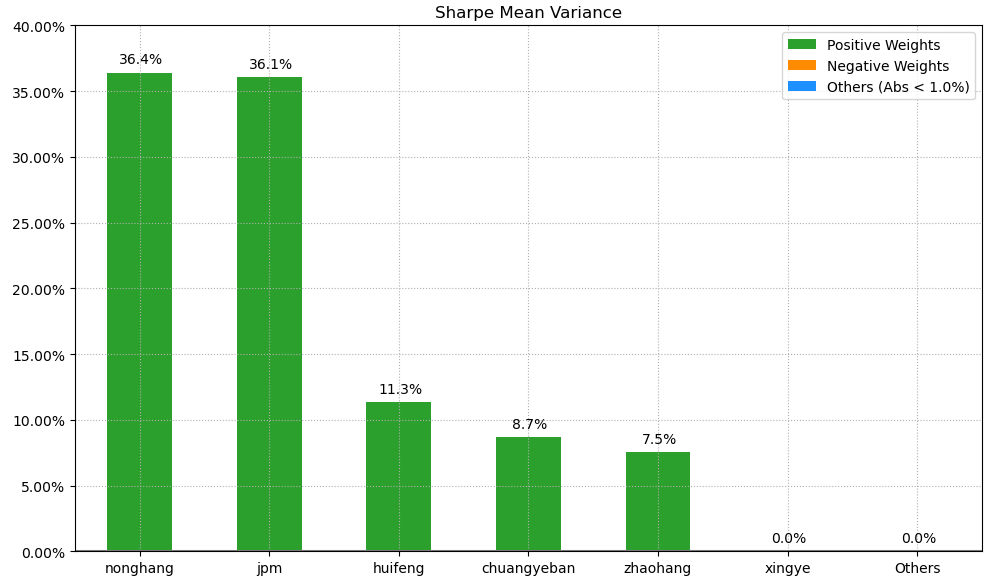 按最高夏普比率配置的话,系统给的权重为0,最高权重给了农业银行占比36.4%。(注:占比越高越好)