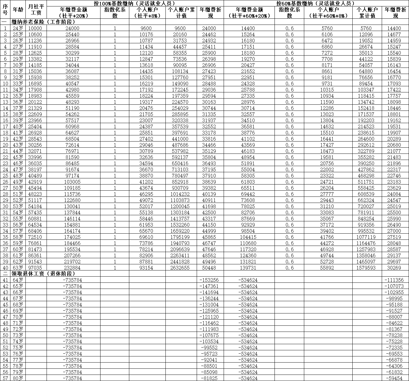 5、24-63岁工作,缴纳养老金,64-80岁领取退休工资