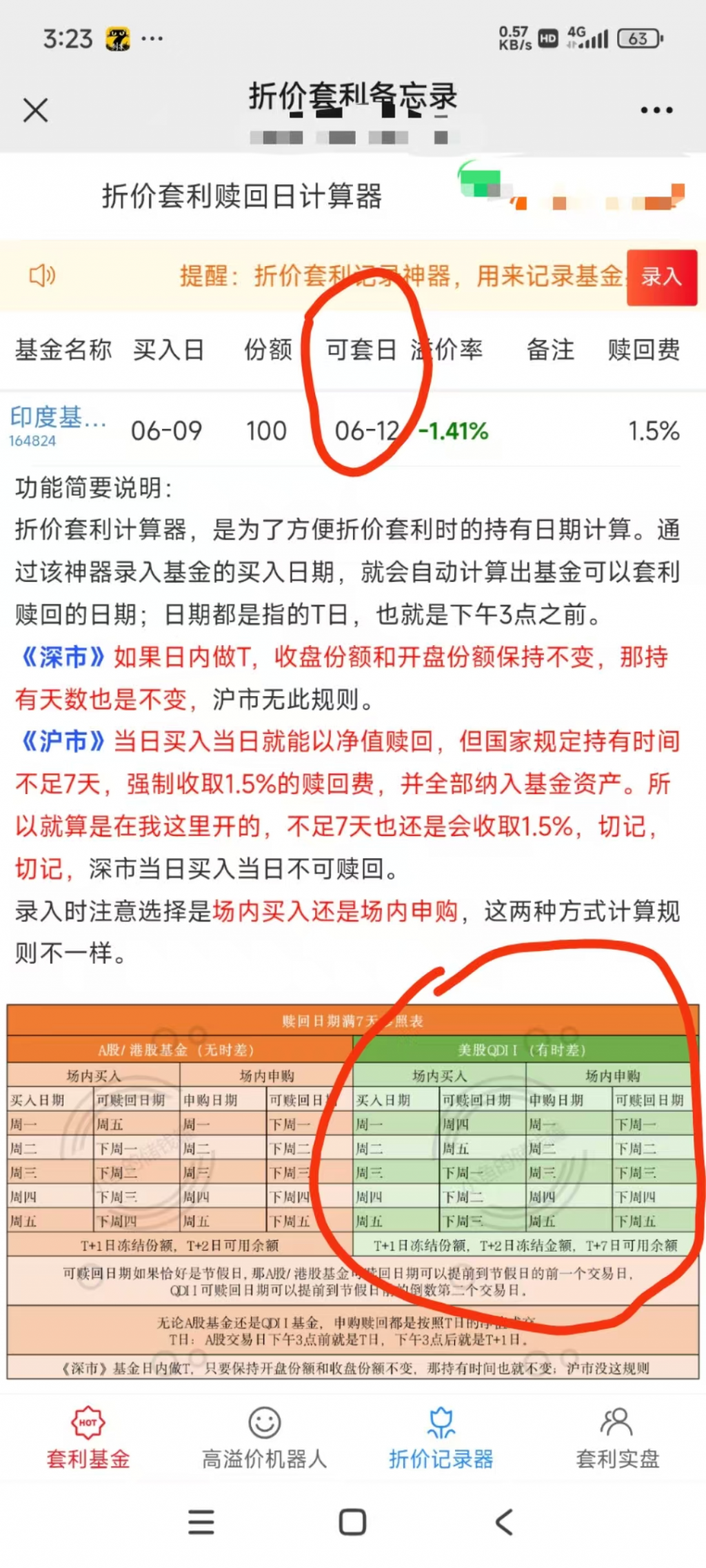 6月9日印度基金164824,实时折价率在1.6x%,遂买入部分仓位,想的是1.6x的折价,直接赎回似乎也可以赚0.1x,但是好像第二天才能发起赎回,且安全垫不够,所以想持有7天赎回。
