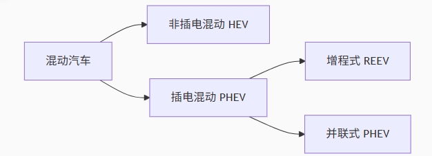 根据油电两套动力系统的结合方式,插电式分串联式和并联式两种,其中串联式另一个名字叫增程式。所以增程式是插电式的子集,它俩并不互斥。增程式没有发动机和变速箱,就是在纯电车的基础上加了油箱和发电机,多了烧汽油给电池充电的功能,其他性能和纯电车一样。
