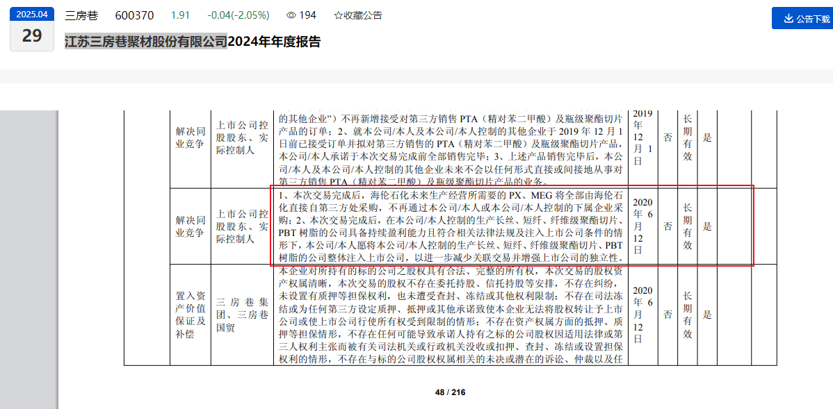 查询年报发现,江苏三房巷聚材股份有限公司与大股东控制的下属公司存在大量关联交易。当初重组海伦石化时候,承诺要注入旗下其它资产,解决关联交易问题。如今5年过去了。公司、大股东丝毫没有履行承诺的行为。恳请监管,督促公司、大股东尽快履行注入资产承诺,不要让承诺成为一纸空文。