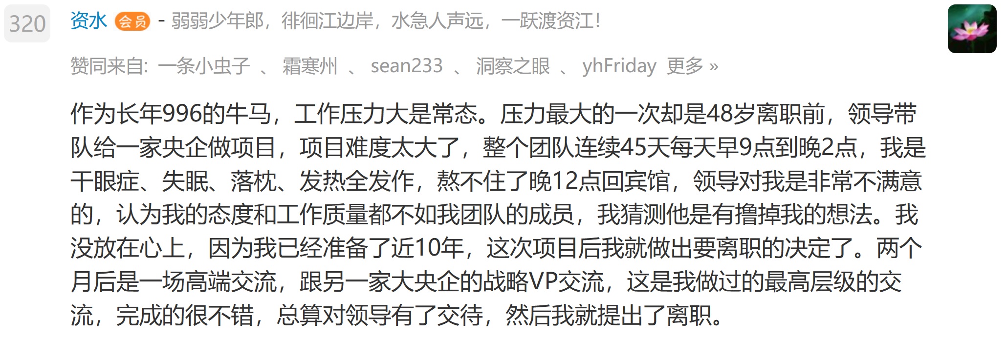 说得真好。 这是我前几天在一个帖子中谈到触发我下定离职决心的经历,当时还有一些细节:我们整个团队30几号人在中信总部大楼与甲方一起封闭研讨,我只能在9点半开盘时上厕所,在手机上点两下操作。就这45天,每天15分钟,挣了150w。我心中泼天的火根本压抑不住,我是一身的本事啊,凭什么要过牛马的生活?大多数人干到60退休了,我虽已知天命,职业生涯却才刚刚开始。希望得到老天爷垂青,健康长寿。这样到人生的...哈哈,资水老师,因为我是全职投资,去年我记得我还问过你大概什么时候全职投资,那时候你回我说大概下半年。当时我内心的想法跟你说的一模一样:你一身本身,为啥给别人当牛马。我当时觉得可能是你的工作没那么累,到手的收入又很高。