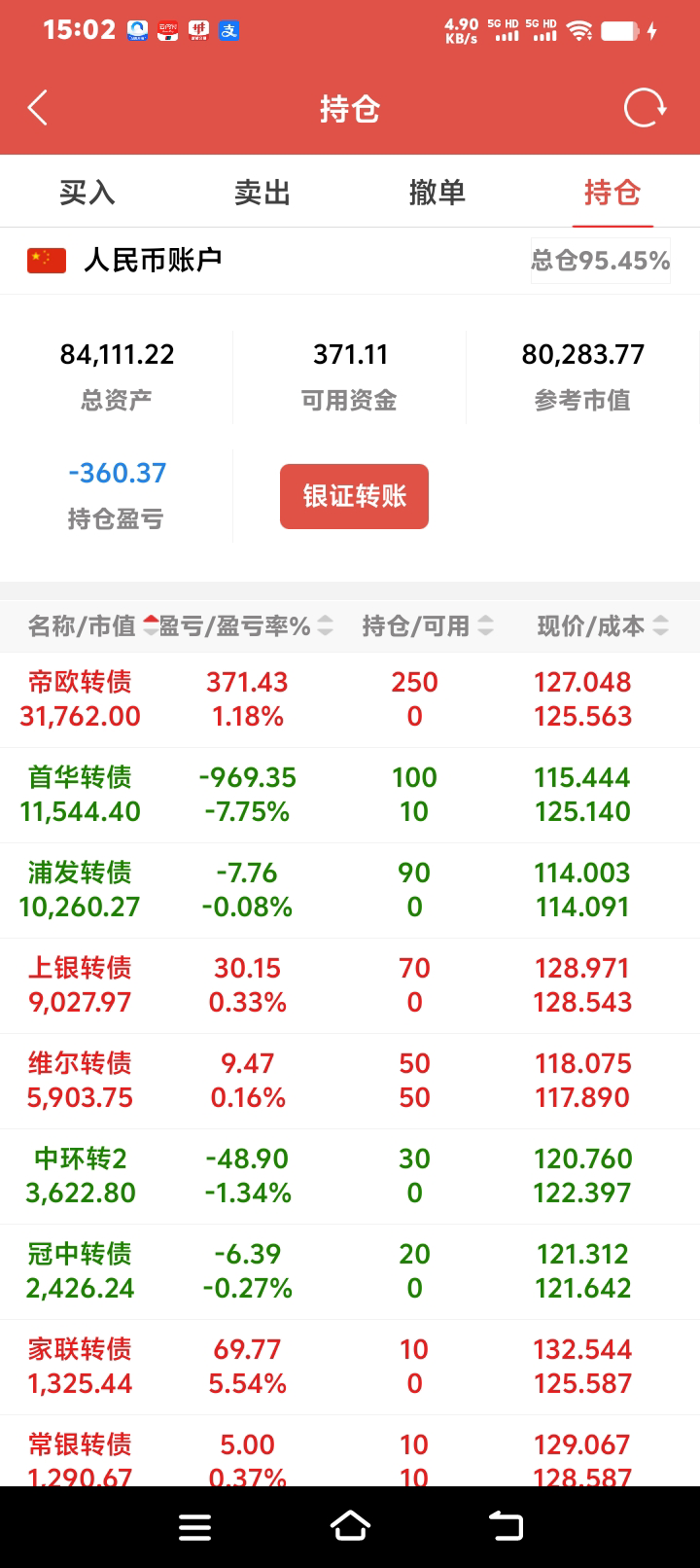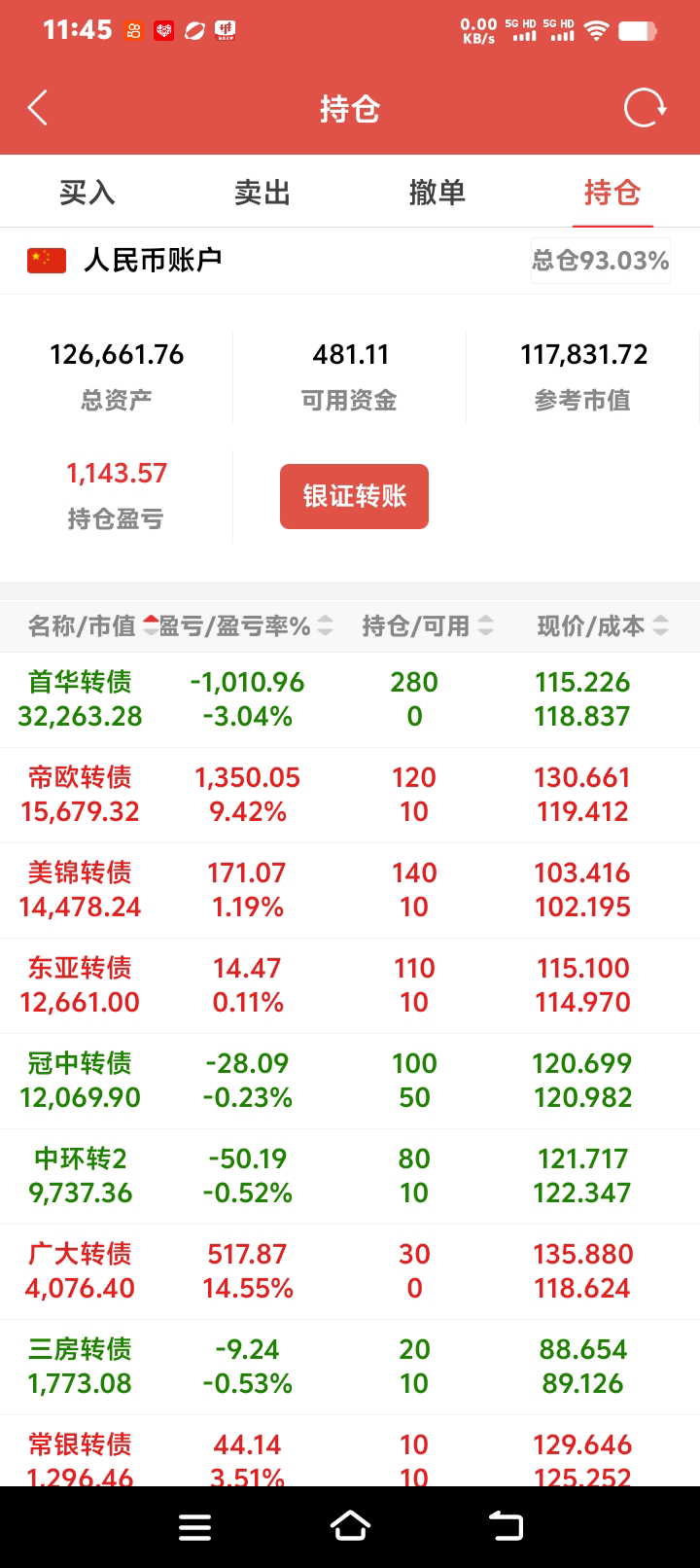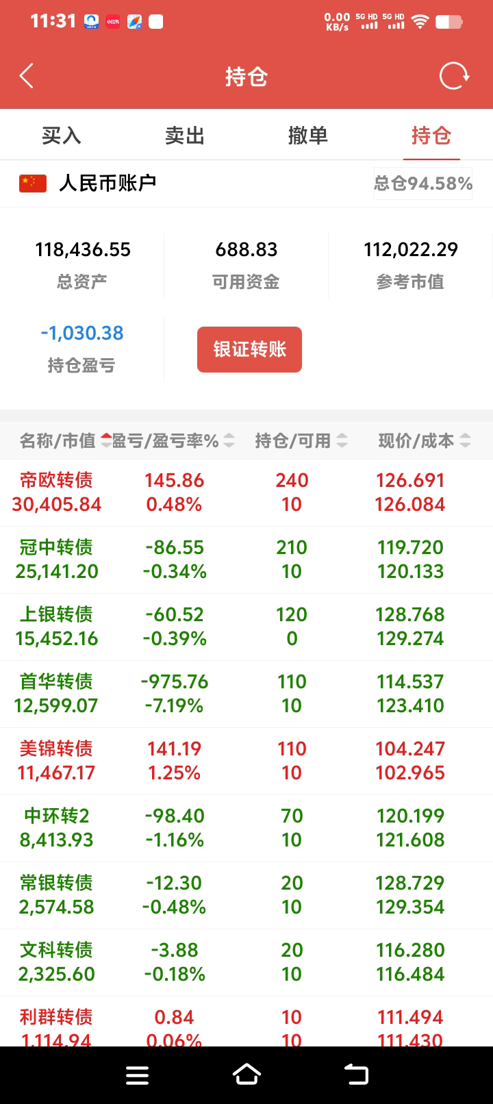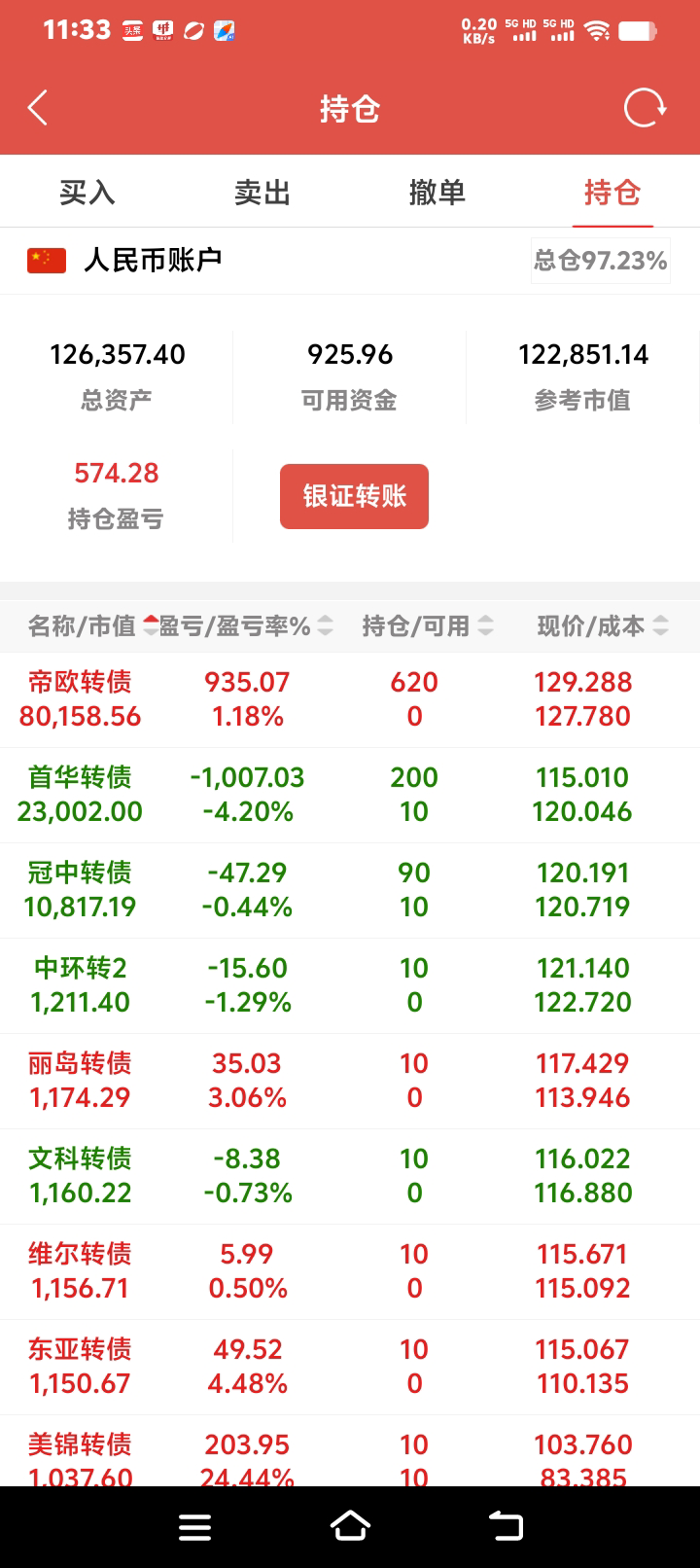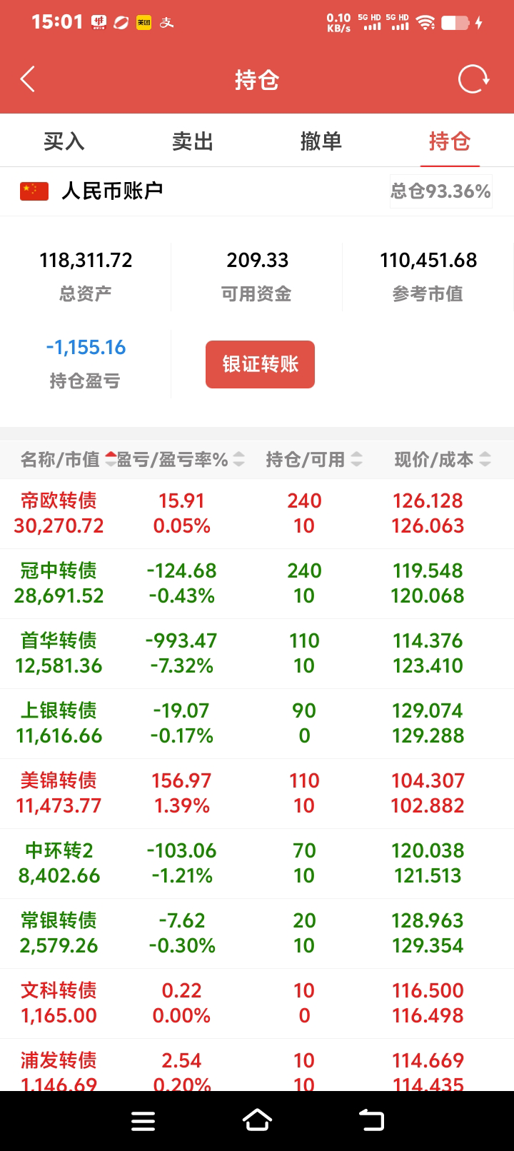今天减仓操作。今天在思考,为什么首华转债与帝欧转债,在较大盈利时又会出现较大浮亏。都是同一个问题,在出现负溢价时,主动加仓太多!以后要建一个规则,130以上的严控仓位,125以上的注意安全。明天退出资金,以表以后行动要改变。