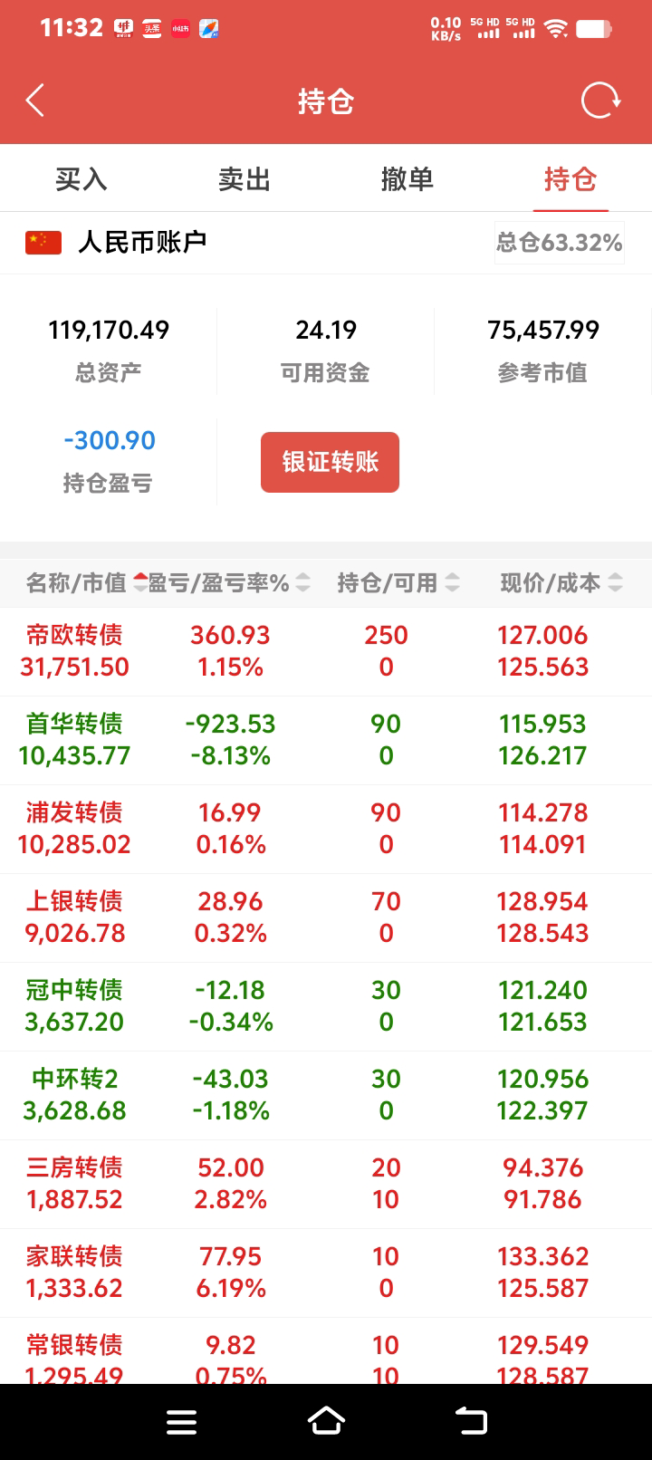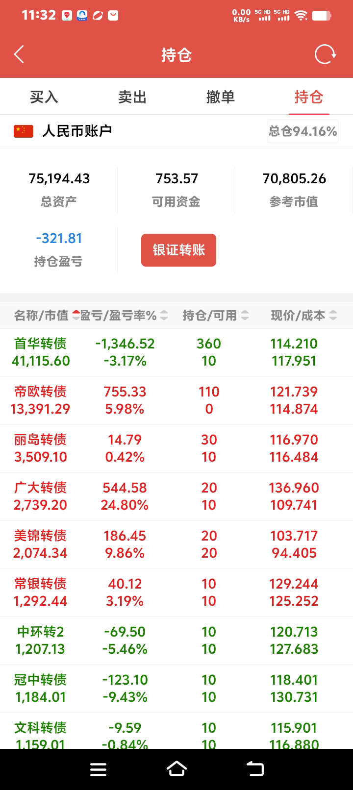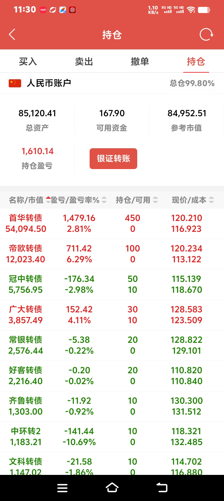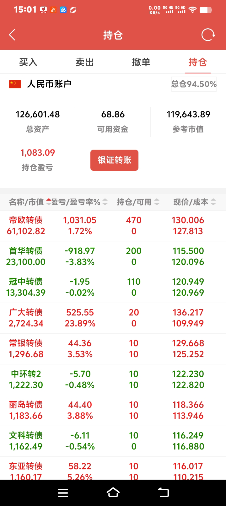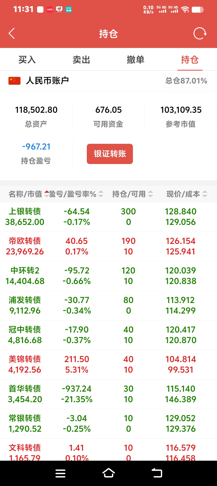 今天减仓操作。今天在思考,为什么首华转债与帝欧转债,在较大盈利时又会出现较大浮亏。都是同一个问题,在出现负溢价时,主动加仓太多!以后要建一个规则,130以上的严控仓位,125以上的注意安全。明天退出资金,以表以后行动要改变。