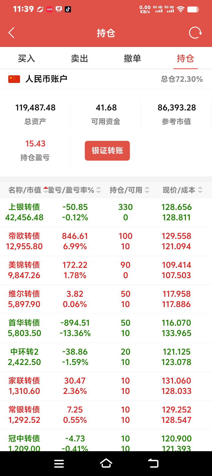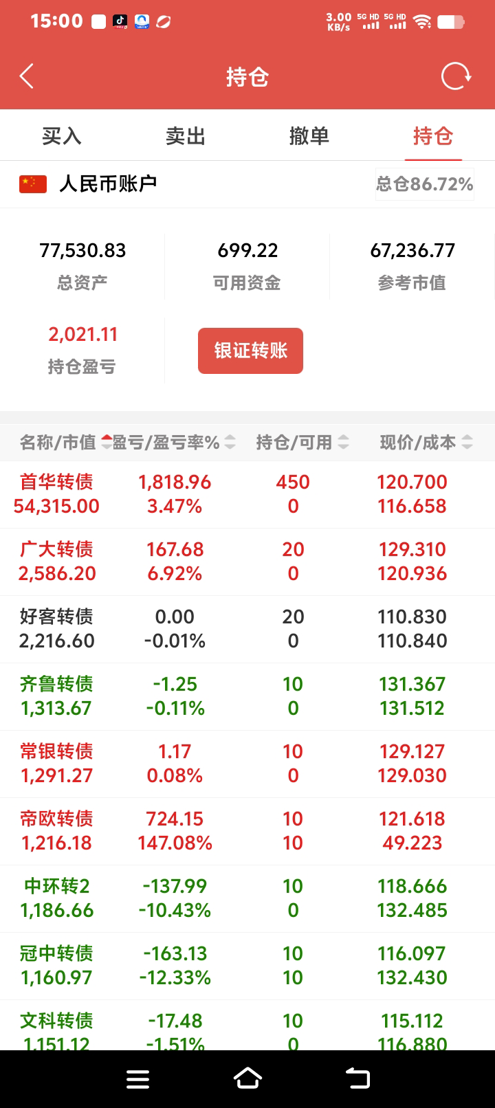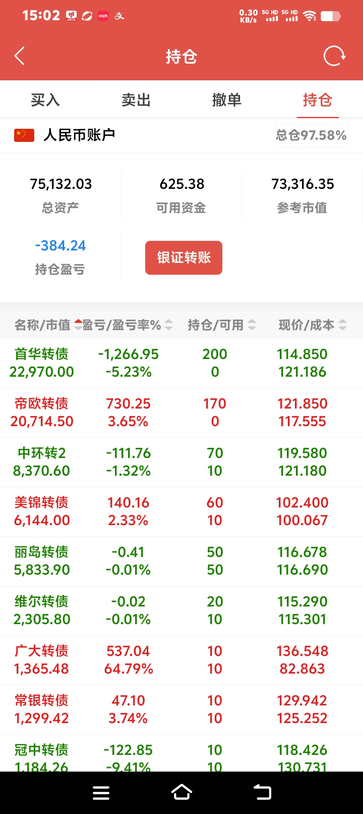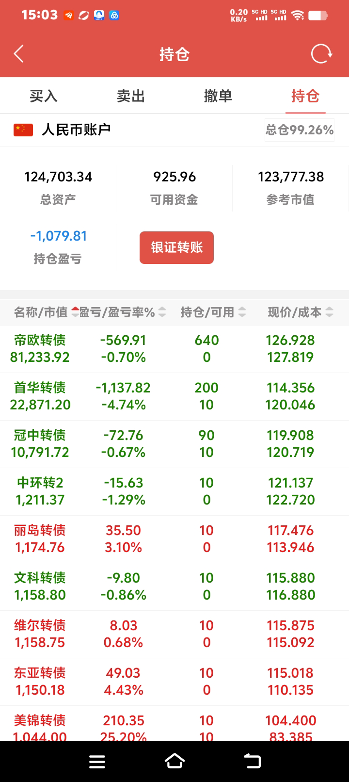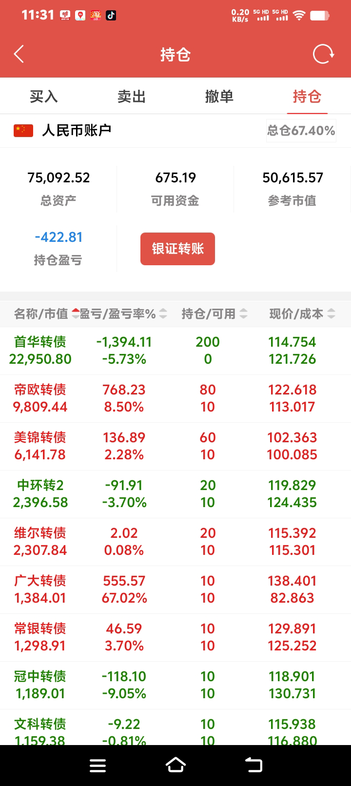 今天减仓操作。今天在思考,为什么首华转债与帝欧转债,在较大盈利时又会出现较大浮亏。都是同一个问题,在出现负溢价时,主动加仓太多!以后要建一个规则,130以上的严控仓位,125以上的注意安全。明天退出资金,以表以后行动要改变。