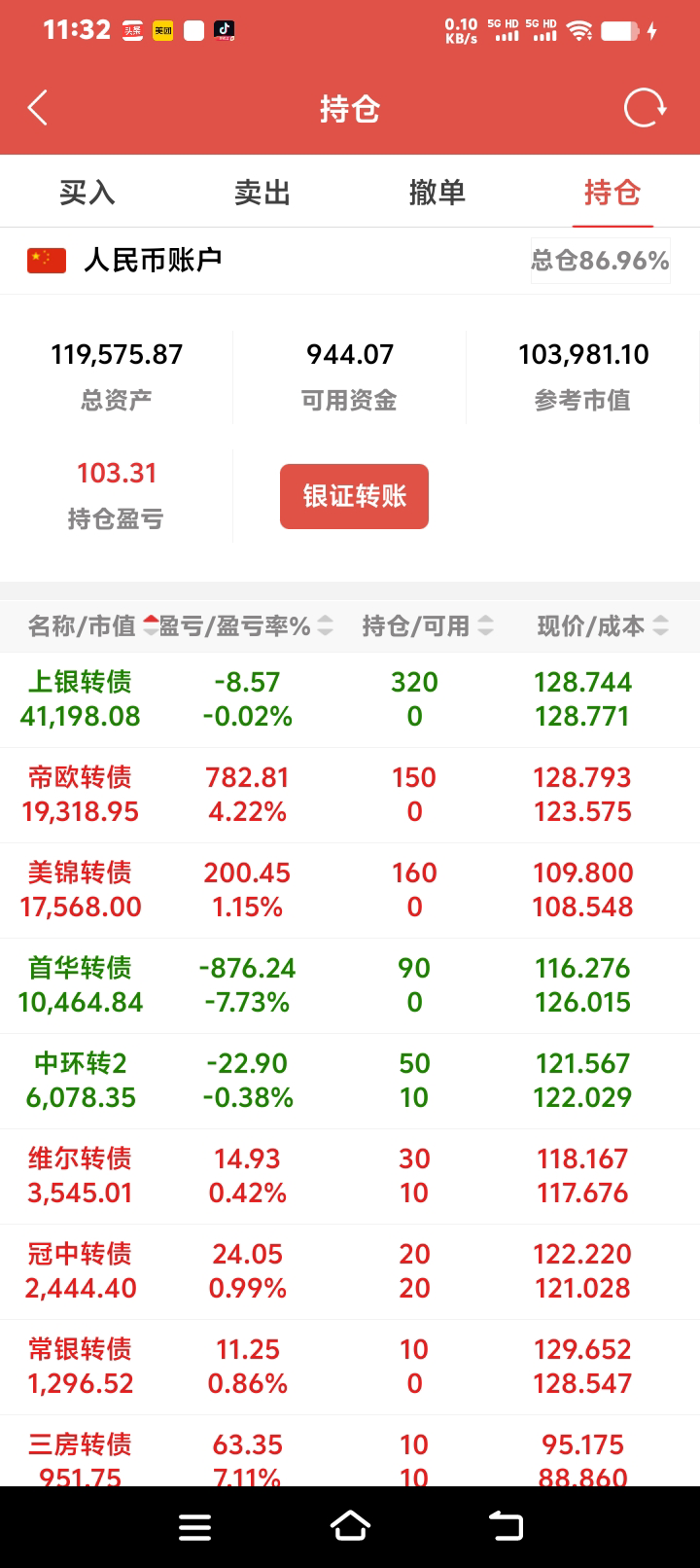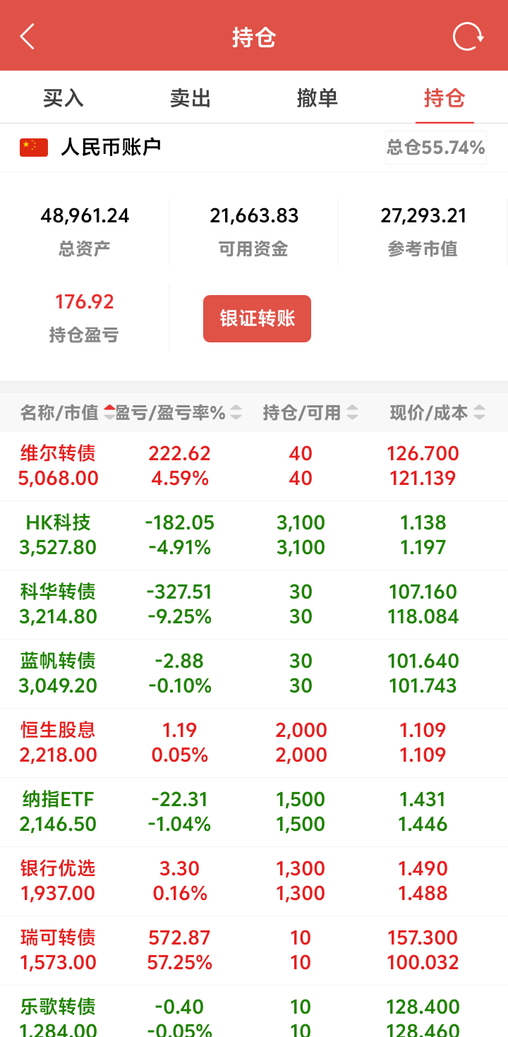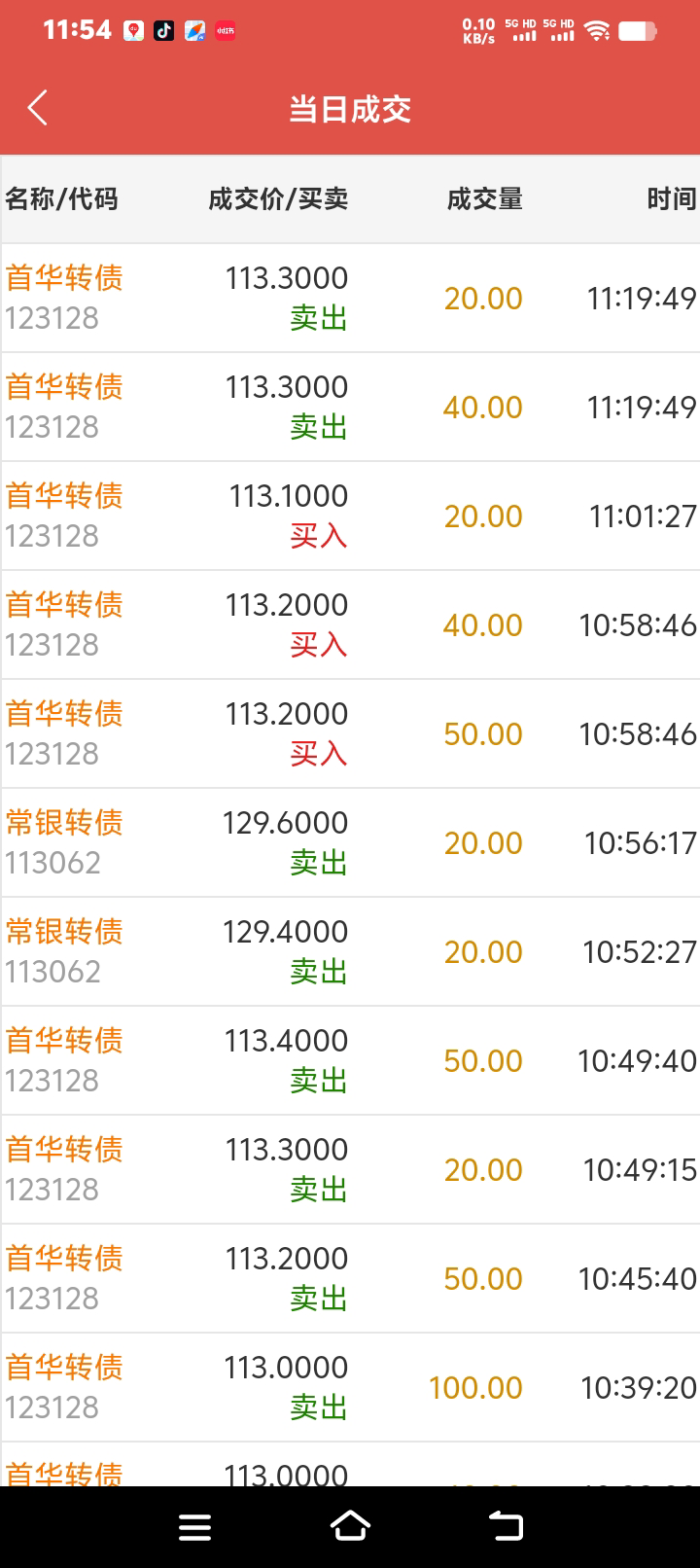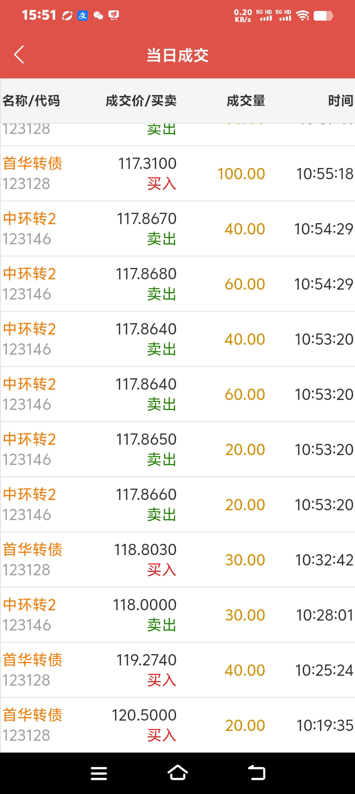 今天减仓操作。今天在思考,为什么首华转债与帝欧转债,在较大盈利时又会出现较大浮亏。都是同一个问题,在出现负溢价时,主动加仓太多!以后要建一个规则,130以上的严控仓位,125以上的注意安全。明天退出资金,以表以后行动要改变。
