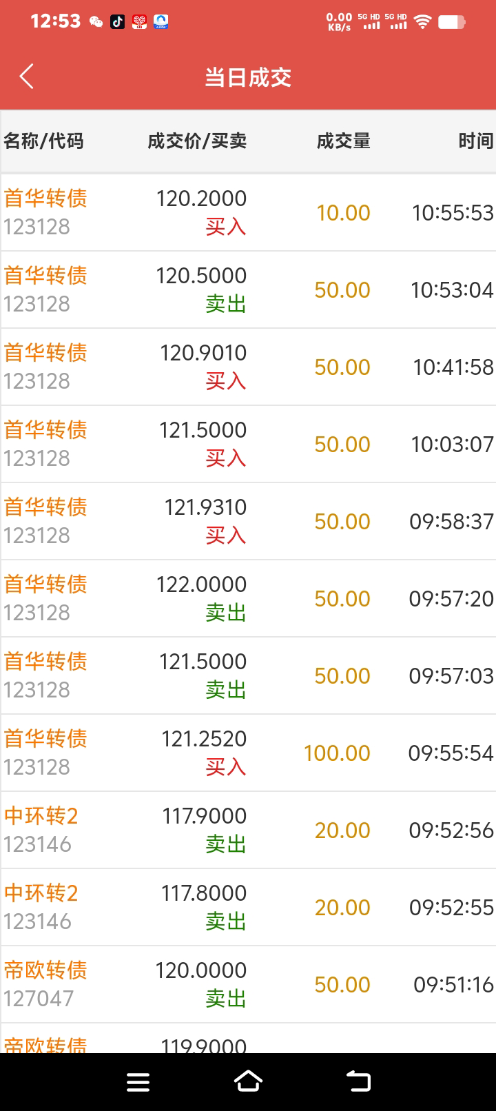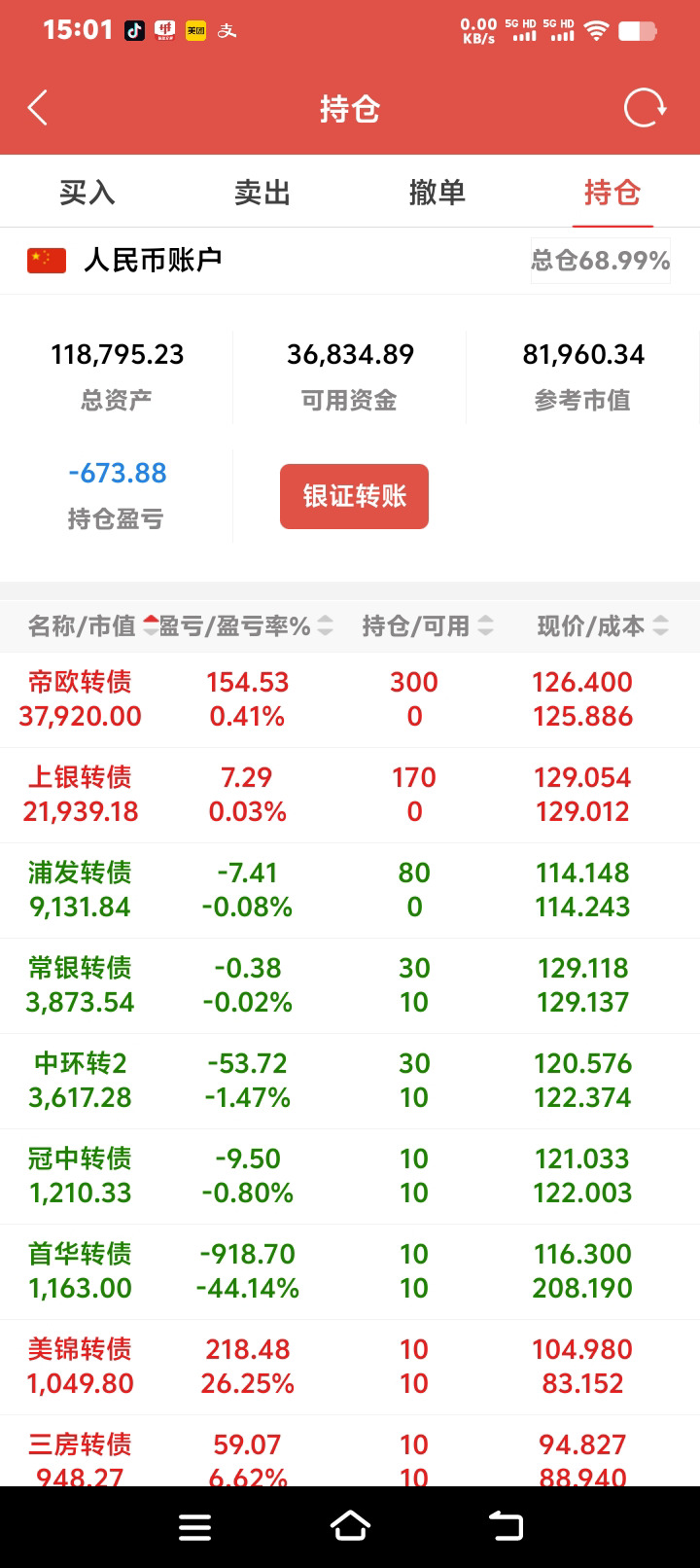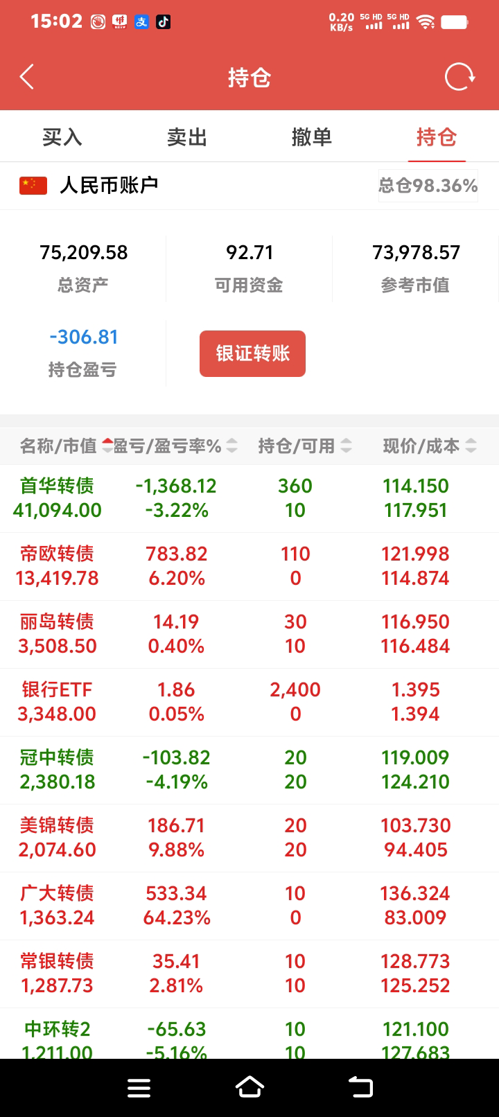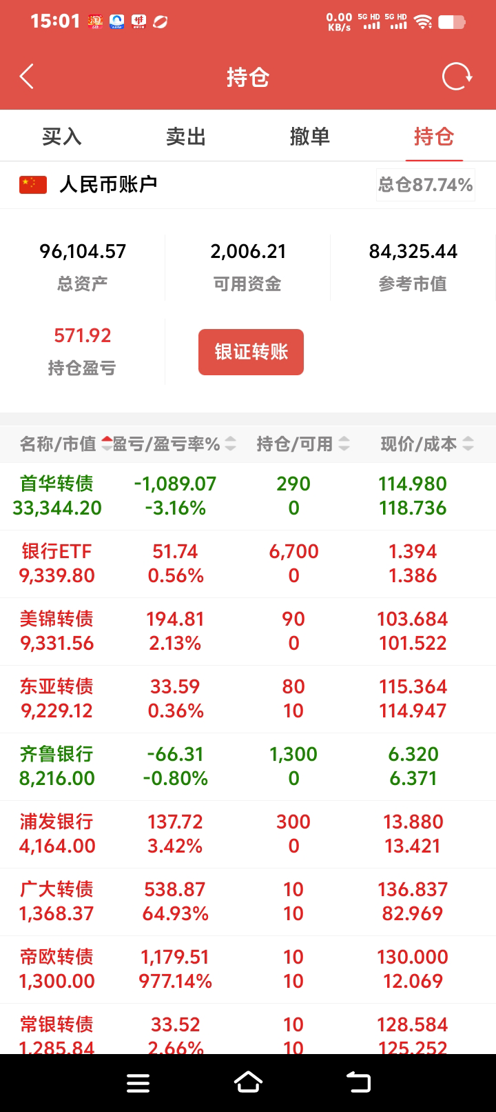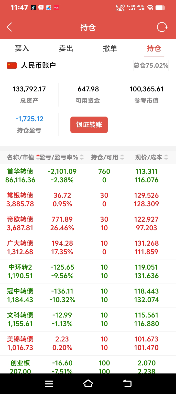 今天减仓操作。今天在思考,为什么首华转债与帝欧转债,在较大盈利时又会出现较大浮亏。都是同一个问题,在出现负溢价时,主动加仓太多!以后要建一个规则,130以上的严控仓位,125以上的注意安全。明天退出资金,以表以后行动要改变。