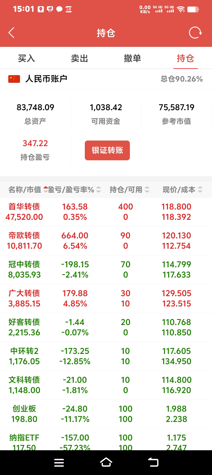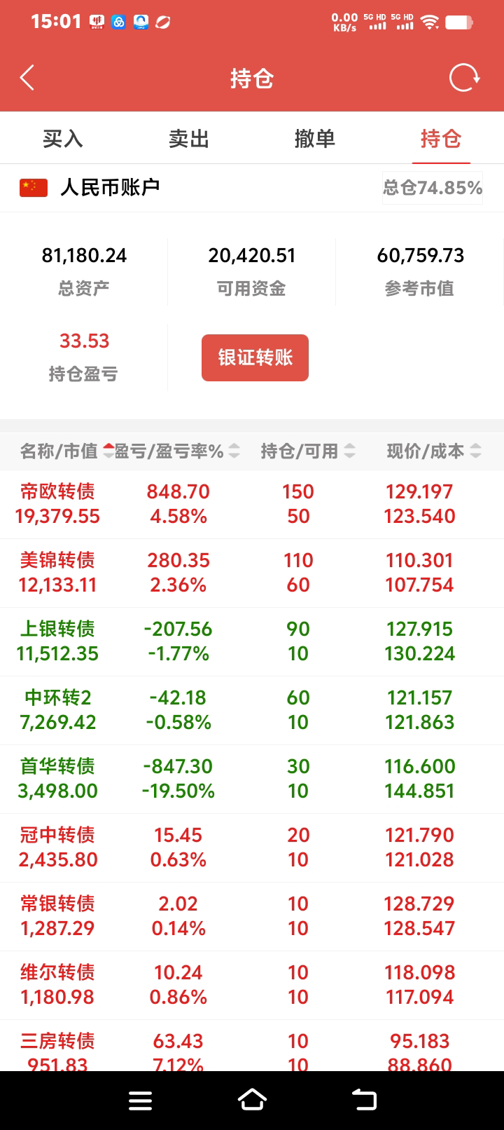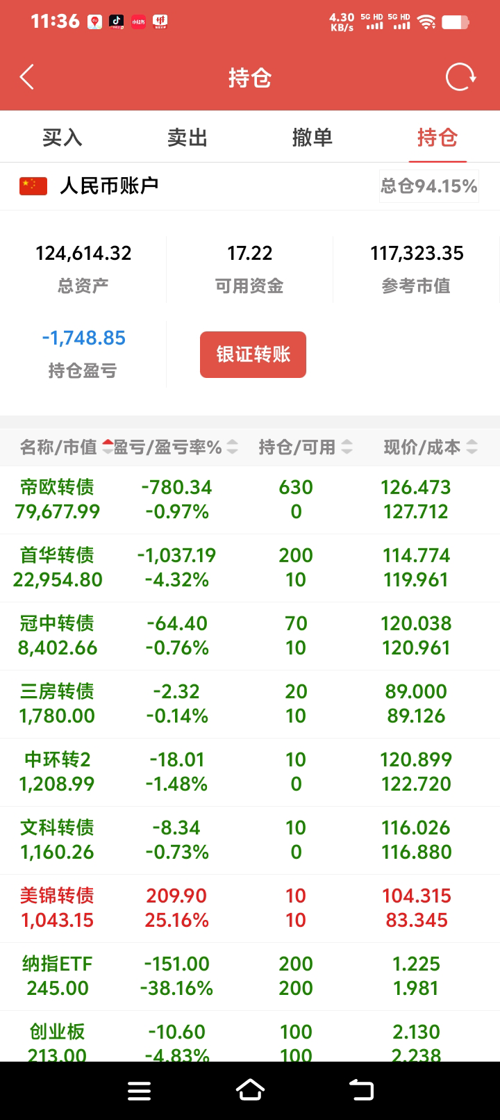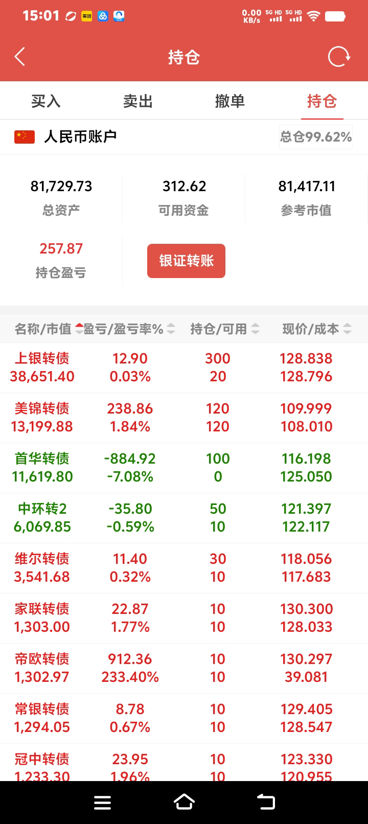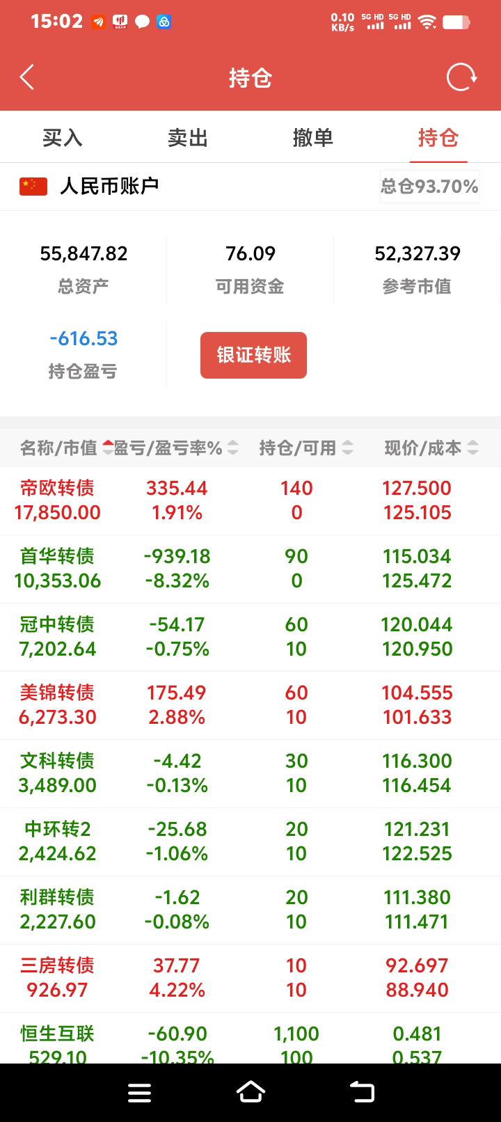 今天减仓操作。今天在思考,为什么首华转债与帝欧转债,在较大盈利时又会出现较大浮亏。都是同一个问题,在出现负溢价时,主动加仓太多!以后要建一个规则,130以上的严控仓位,125以上的注意安全。明天退出资金,以表以后行动要改变。