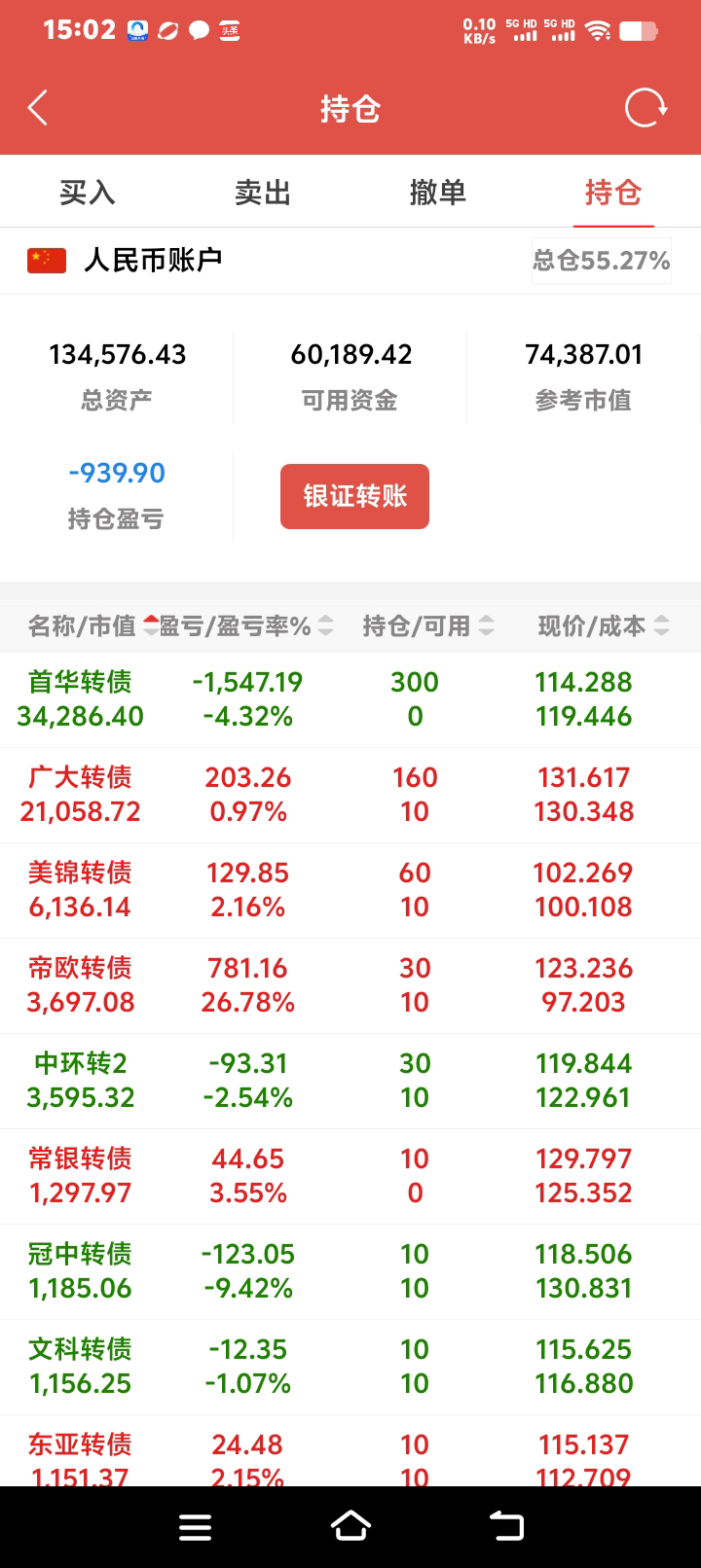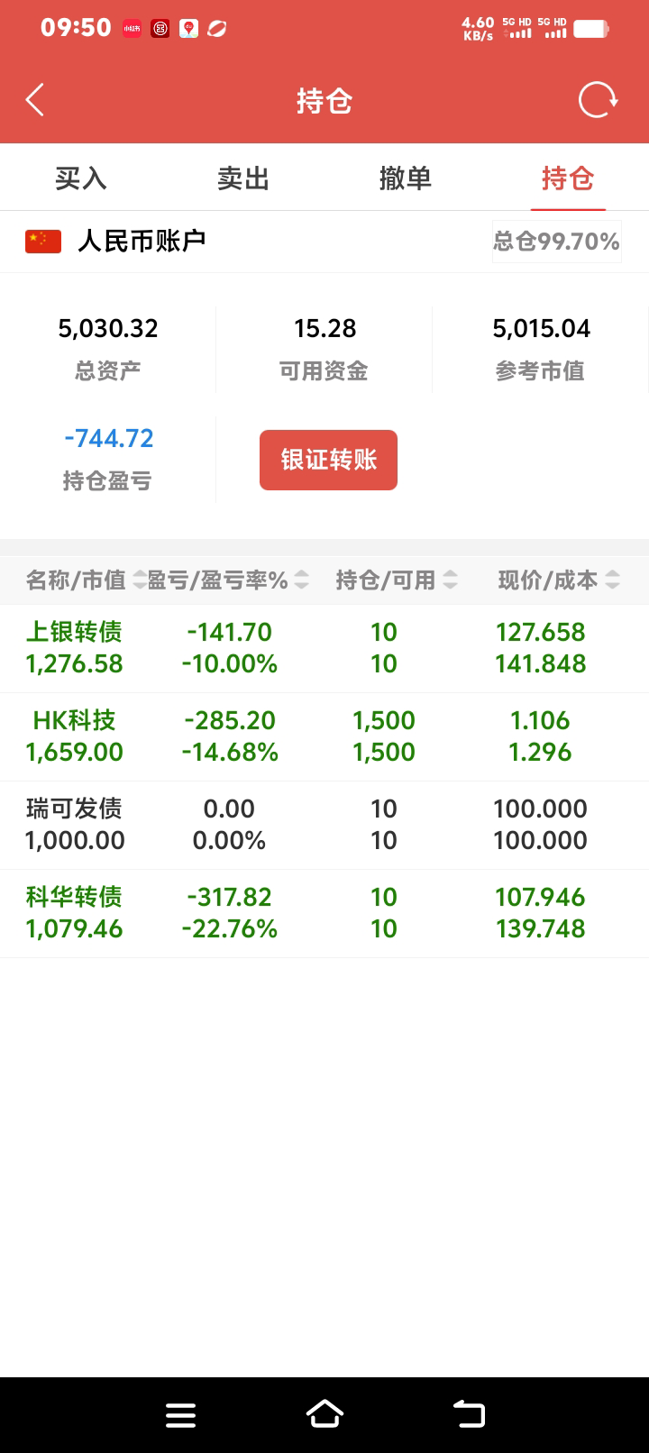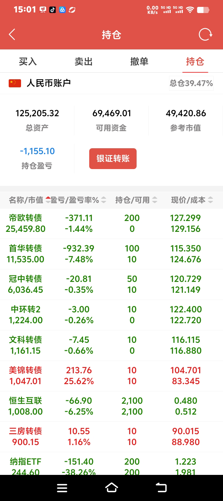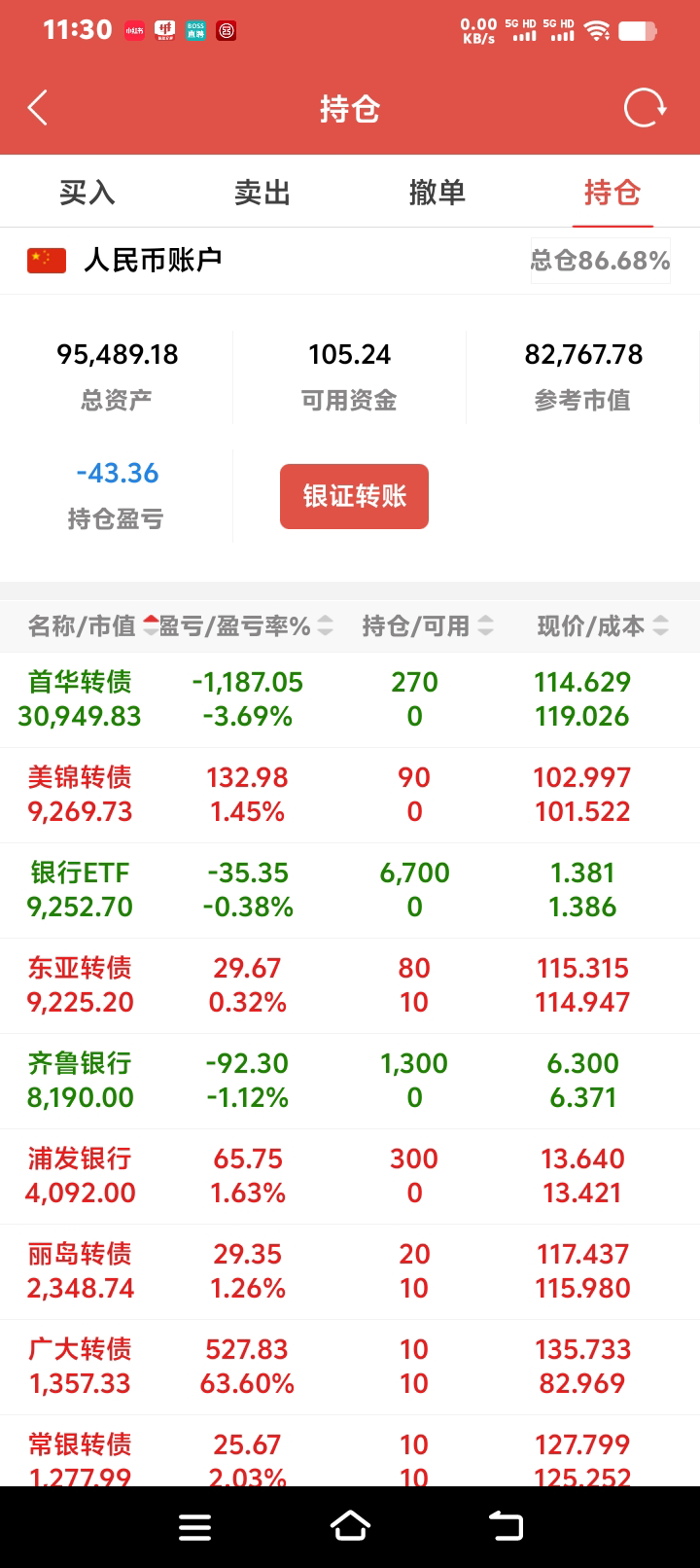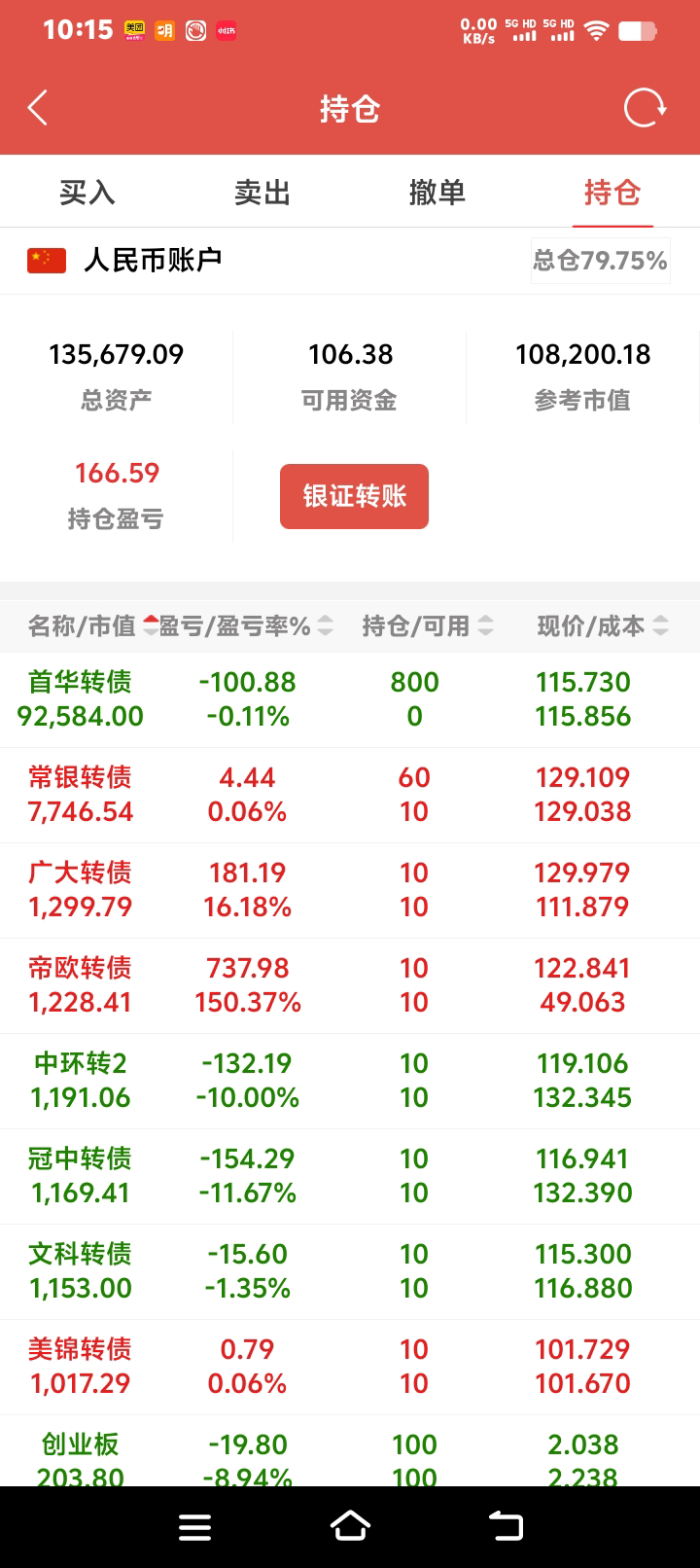 今天减仓操作。今天在思考,为什么首华转债与帝欧转债,在较大盈利时又会出现较大浮亏。都是同一个问题,在出现负溢价时,主动加仓太多!以后要建一个规则,130以上的严控仓位,125以上的注意安全。明天退出资金,以表以后行动要改变。