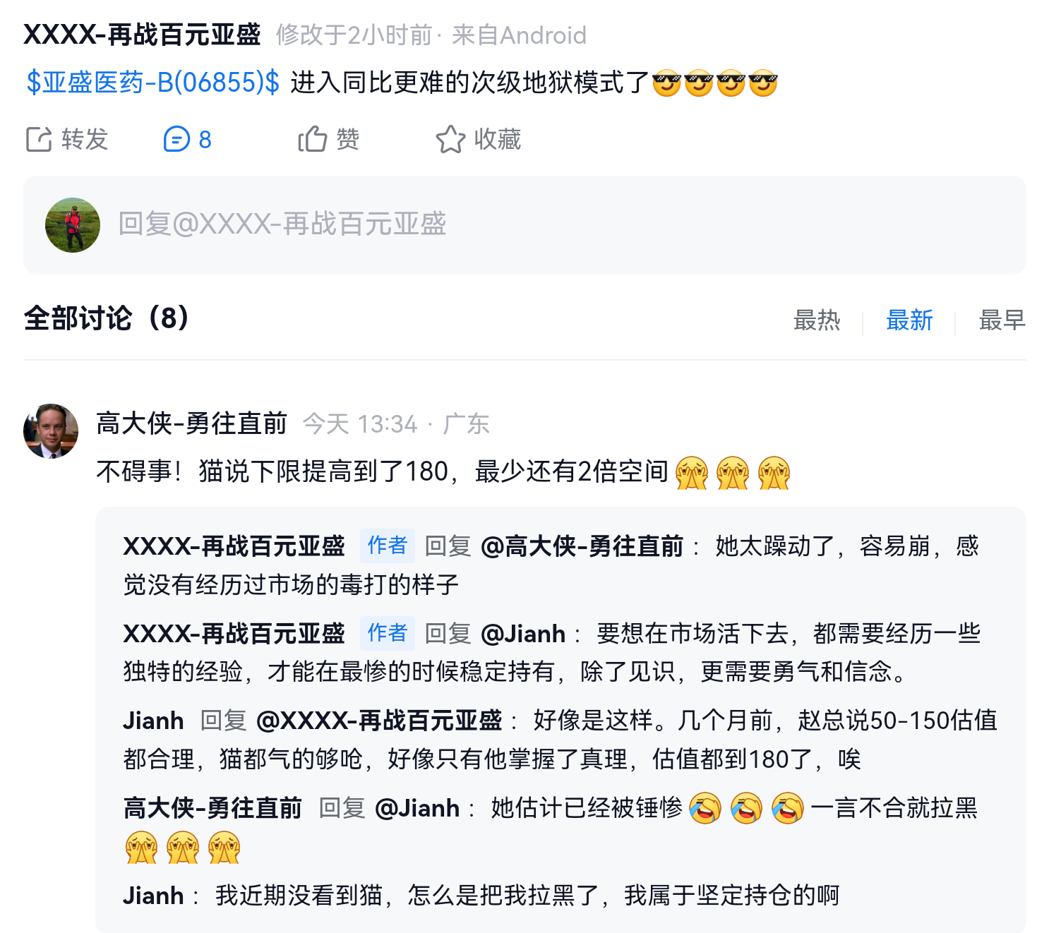 想右侧卖出,往往是卖不出去。比如亚盛医药,开始的估值大概是70-100元,到80元以上可以左侧卖出一部分。但我没舍得卖,并且我们(包括很多基本面派投资人)把估值又提高了,丢失了部分卖出的好机会。