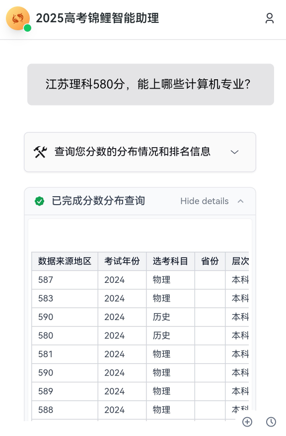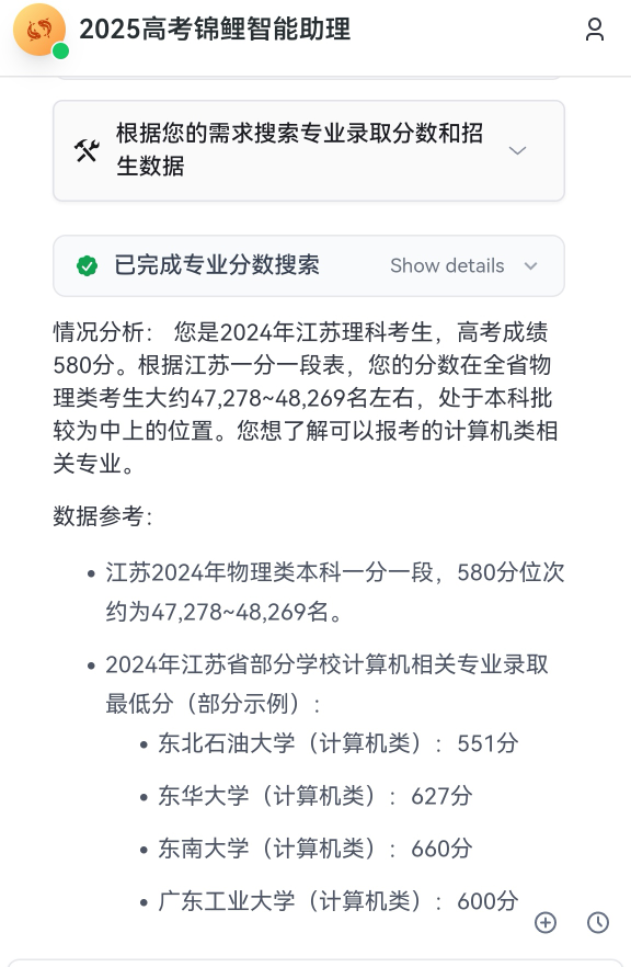 智能错的比较离谱,咨询美术类的江苏533分,竟然推荐的是专科了,还告诉了美术排名位次江苏省2930,大概是不懂得啥是美术类考生,比百度的差多了,百度还知道美术分怎么计算的,每个省的比重,可参考位次的大学以及专业内容和近3年的录取情况,和腾讯元宝的更不能提了,不能套人家的东西,高考填报志愿可是家庭大事,也是小孩一生的重要转折或者说起点,比一次投资要谨慎啊,专业的事还是给专业的人干吧,自己测试超过d...谢谢你体验我的产品。系统按照普通本/专科批次的分数去推荐了相关学校。对于艺考类的考生的文化分打折这种情况,系统还在逐渐完善。另外系统能力闭眼都是超过deepseek的,因为是站在巨人的肩膀上做的产品。