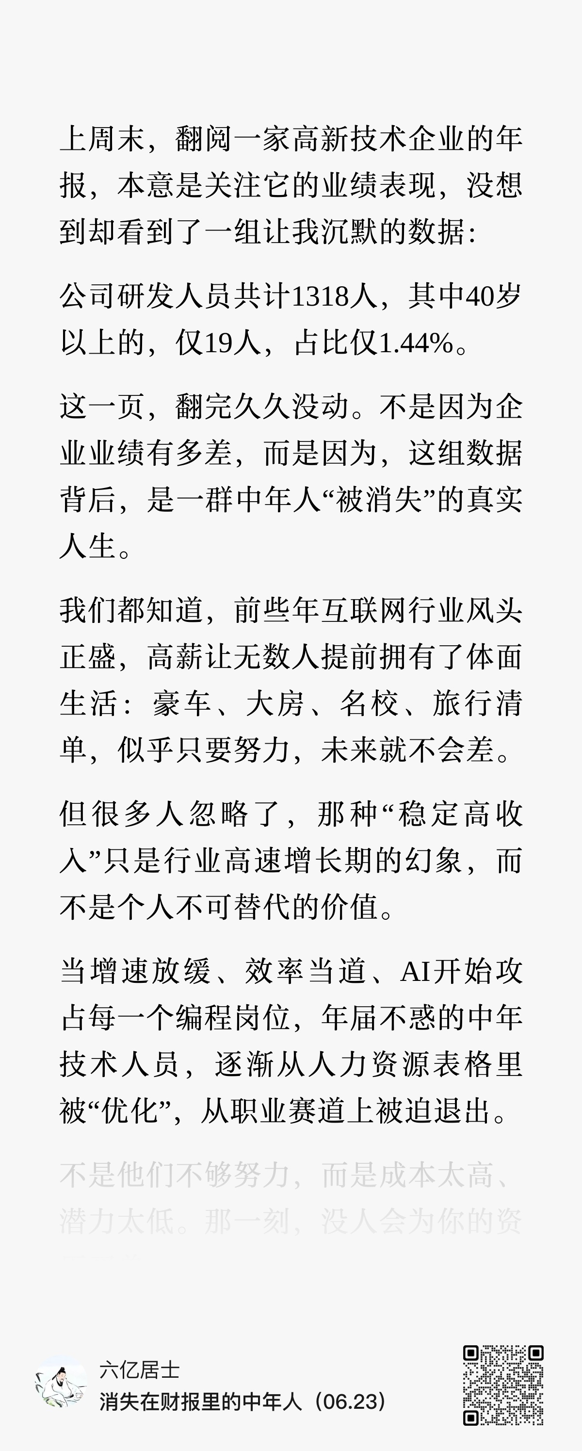 特意去看到了这个帖子,发现精髓也基本上就是楼主图里的这些了,后面看贴的人可以不用去翻了。楼主说了很多,但核心还是类似“普通人的35岁危机”的问题。如果一直只依赖工作赚取现金流的话,这样的危机似乎不可避免,只有极少数的人能够旱涝保收的靠一份工作干到老。所以说白了,还是要培养自己在工作以外赚钱的能力,自媒体也好,投资也罢,甚至收割粉丝,都是潜在的选择。解法反正在这里,能做到怎么样还是看各人。写字楼如青楼这个道理不必多说吧