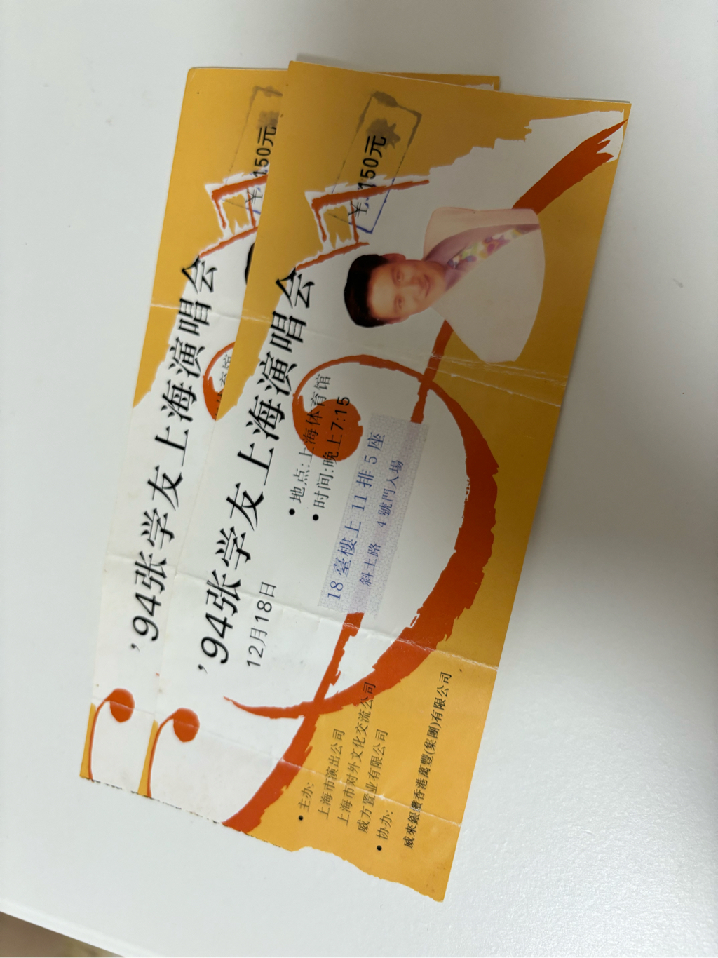 同道中人啊,校长的歌好唱,难度不高,我以前号称走音王子,高音上不去,低音下不来,中音不一定准,但是唱校长的歌还是勉强可以的。那场张学友我也去了,我坐在主席台正对面,第六排,那时中间舞台空地不大,差不多把场地填满了,他走到我这边的时候,我能看见他脸上的疤痕,我还在想他怎么也有,难道也是幼儿园被女同学抓的。那张票我本来也藏着,其实我本来纸质票都藏着,甚至我还有一张马明宇和范志毅签名的四国赛足球票根,然后去了德国后,再回来,发现我的房间都被父母动过了。这些票本来压在我写字台的玻璃下面的都没了,好可惜。