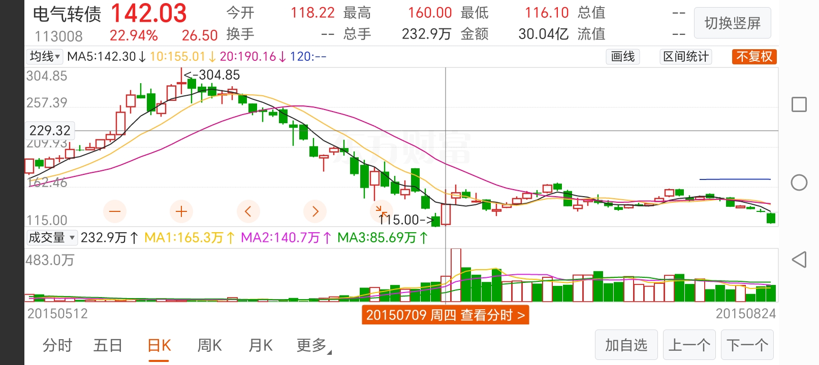 2015年7月7日,大家已经开始讨论分级基金下折时的流动性风险,特别是创业板中小票的,当时我的主要持仓是创业板A,本着君子不立危墙之下的原则,我当天把手头能清的分级A都清仓了,只剩下当天买入的一点国防A因为T+1不能卖。