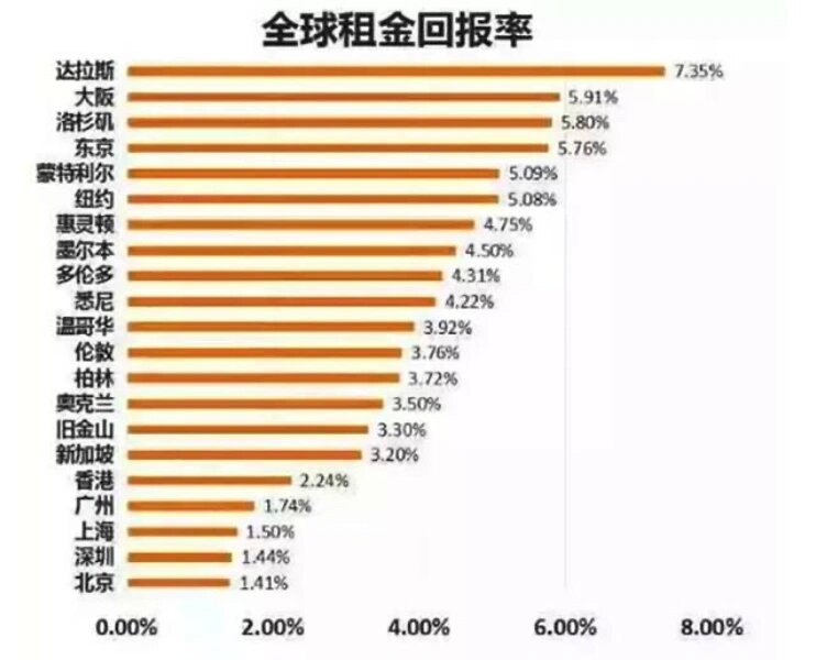 我们这里贷款利率2.4,租金回报率2.4就很正常。纽约如果只有6%,那是真不高,房产税1%-2%,无风险国债利率4%,贷款7%。一般租金回报率很难超过贷款利率。因为一旦超过,就会出现疯狂加杠杆买房收租的情况。当然这里的租金回报是扣除装修折旧和物业费成本的。比如现在贷款利率2.4%,如果租金回报率达到3.4%, 有1个点的差距,就会出现买一套房的钱,买7套收租的套利者。每套房还能带来1个点的收益,...这个是理论上的,只在盘整和上涨阶段有效。漫漫下跌路,跌去的房价比租金多多了,谁还敢上杠杆。