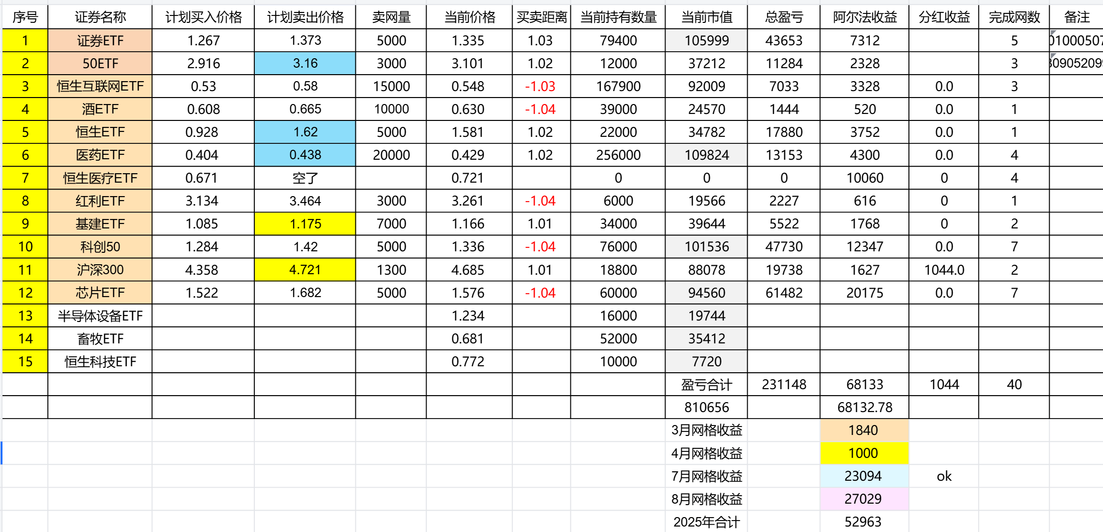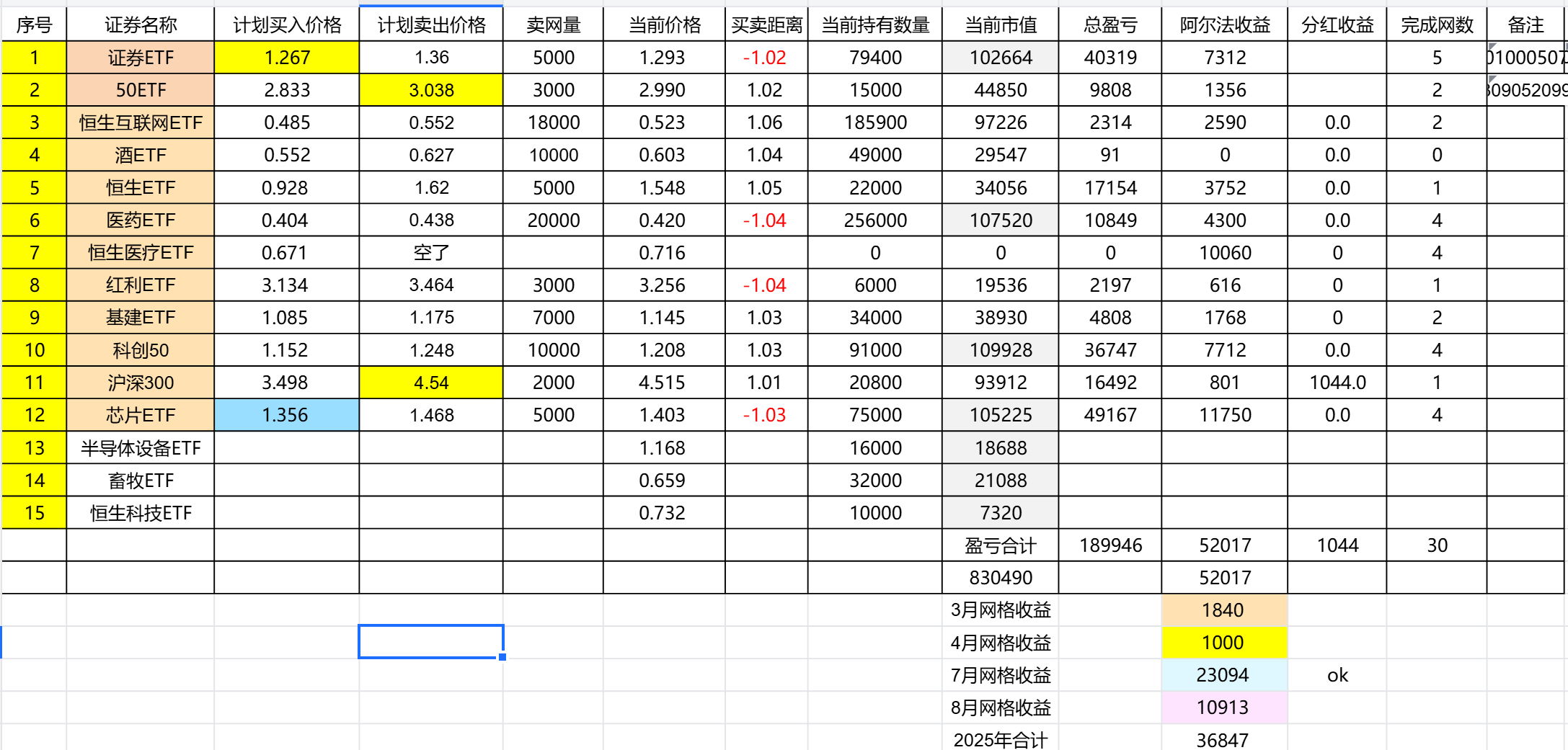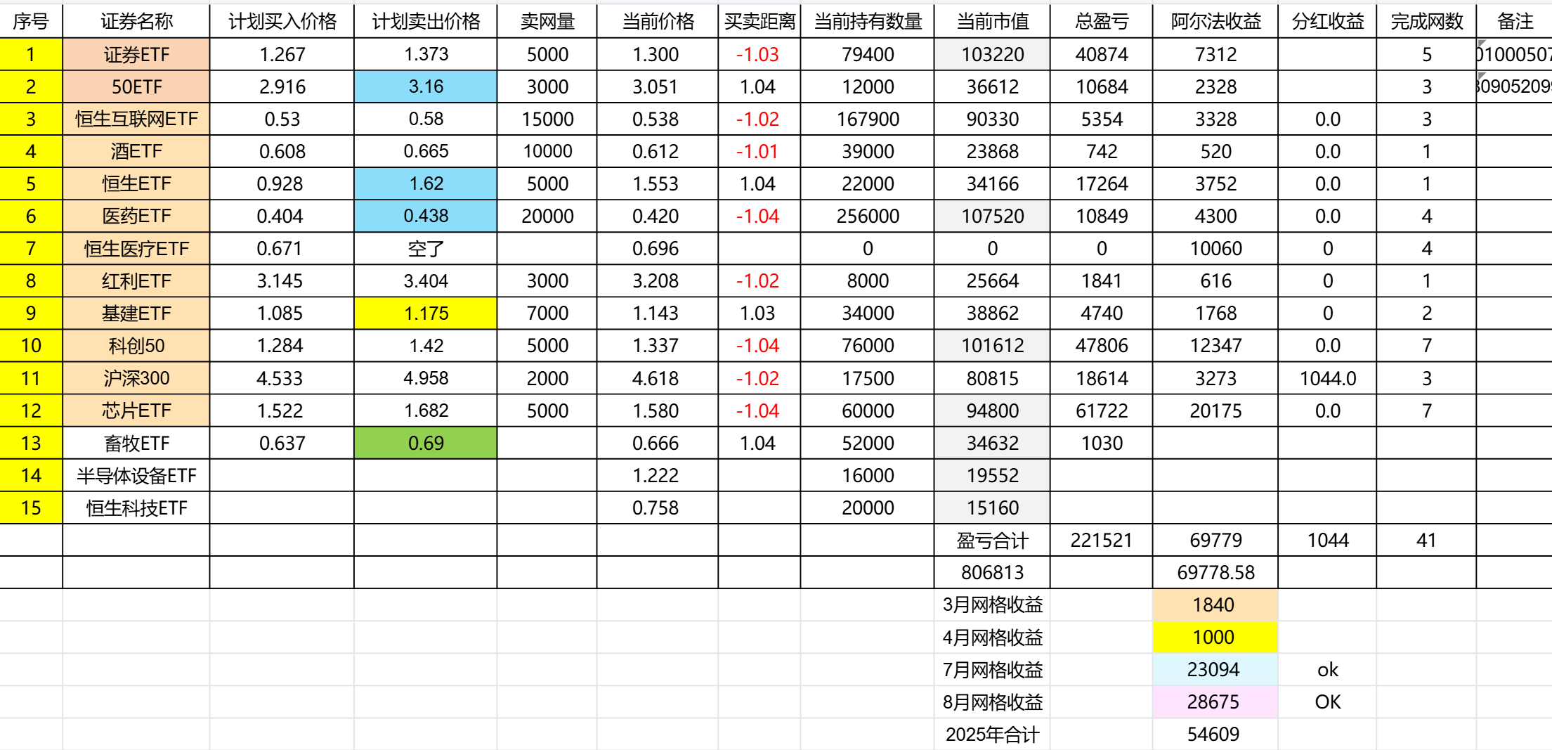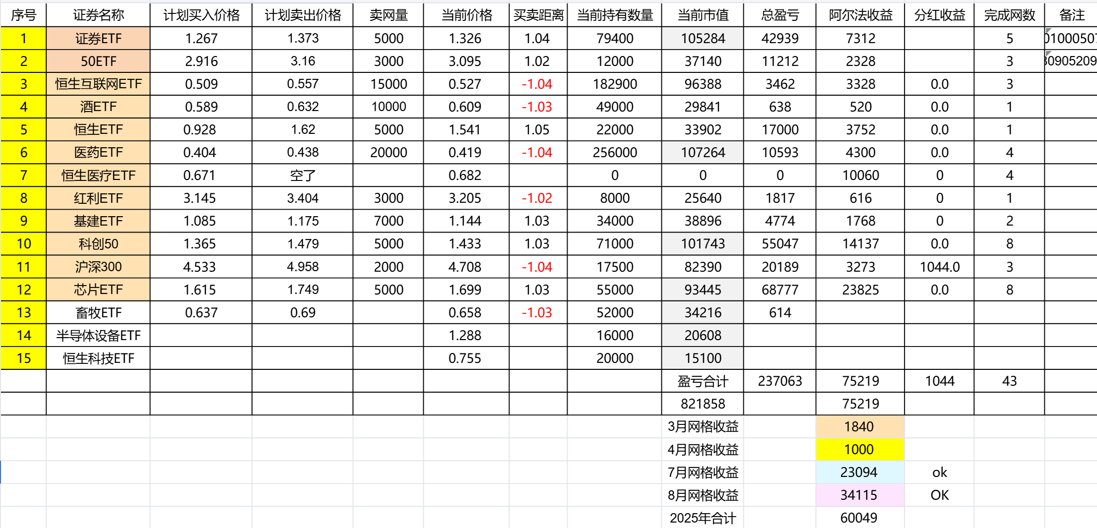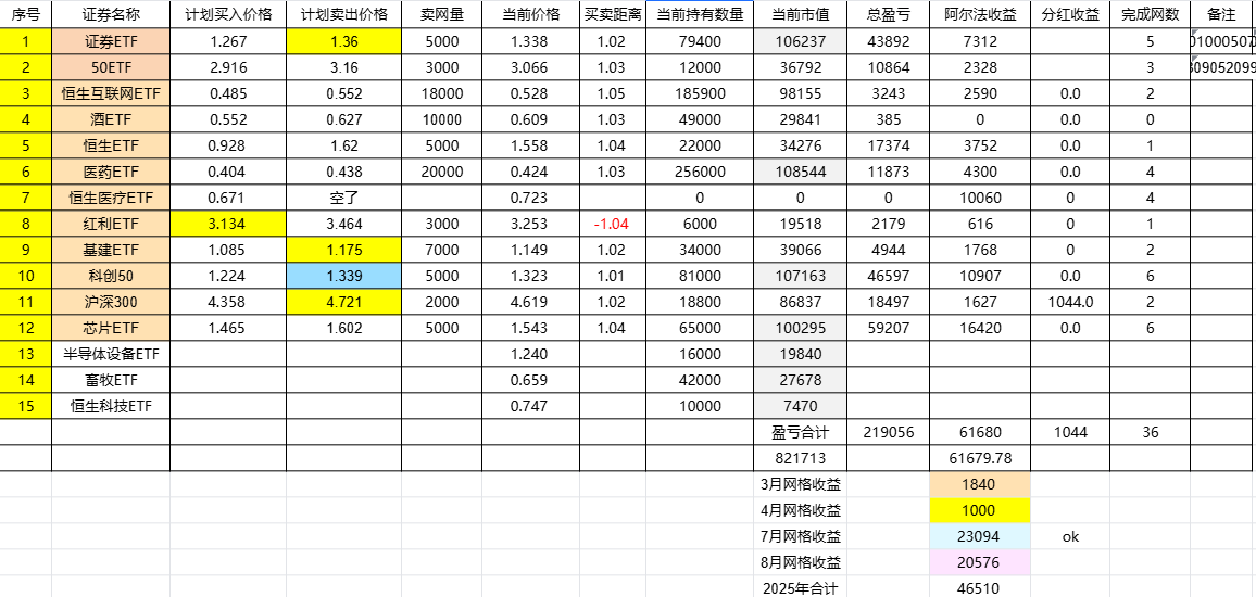 今天终于实现了卖卖卖了,科创50和芯片都连续卖了2网,还分别卖了一网沪深300和上证50,共计6网。8月网格收益来到了2W+;