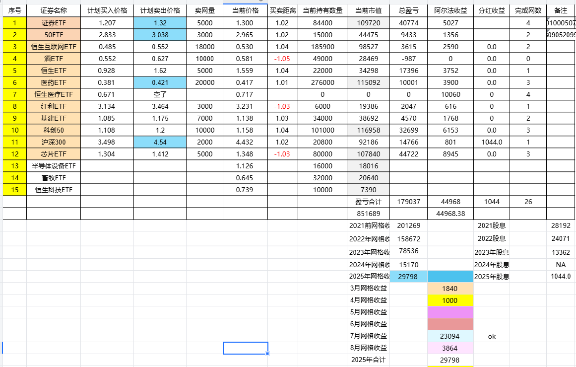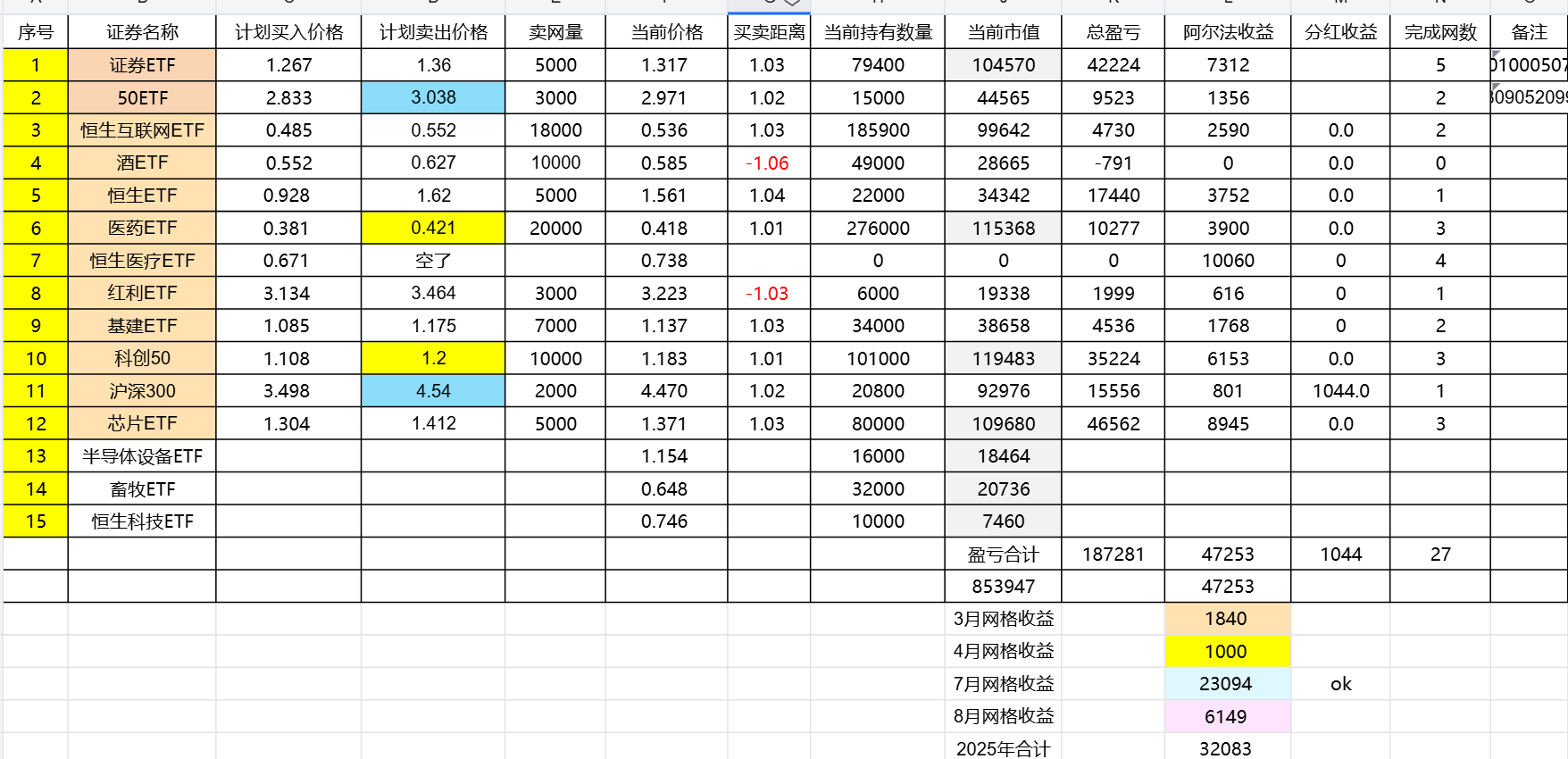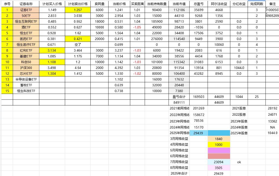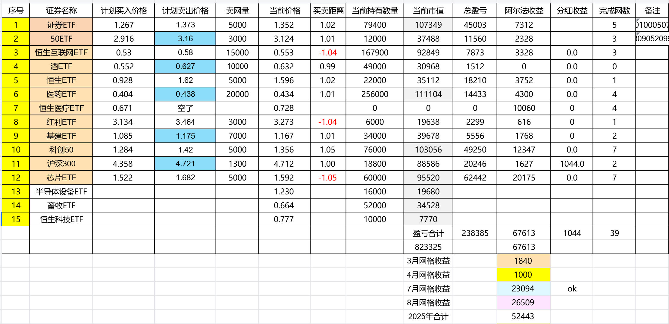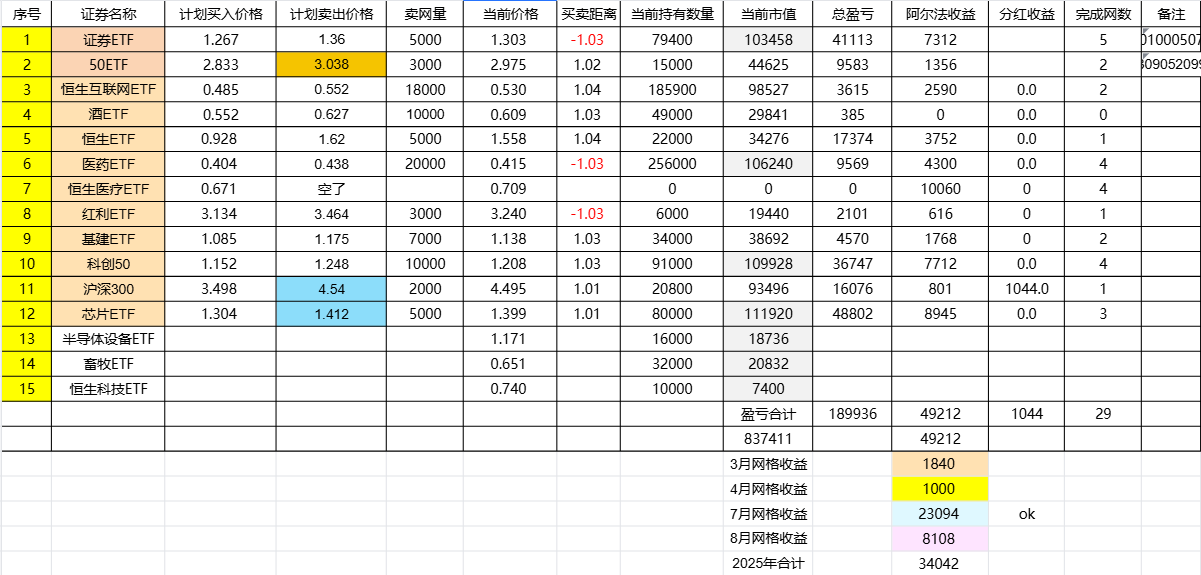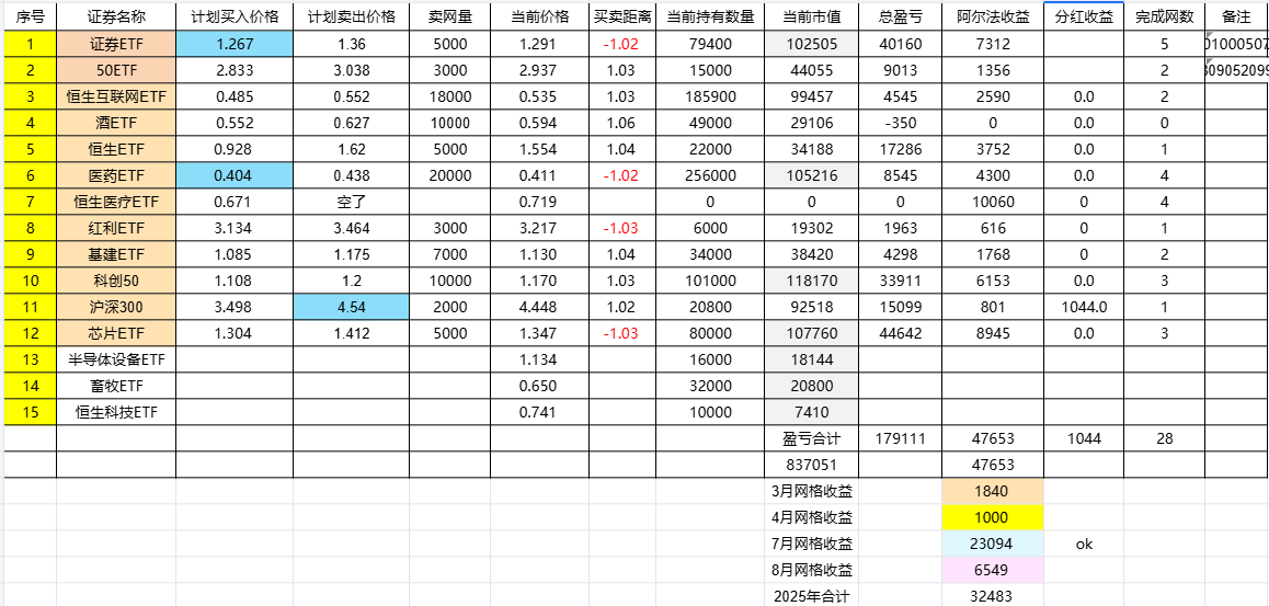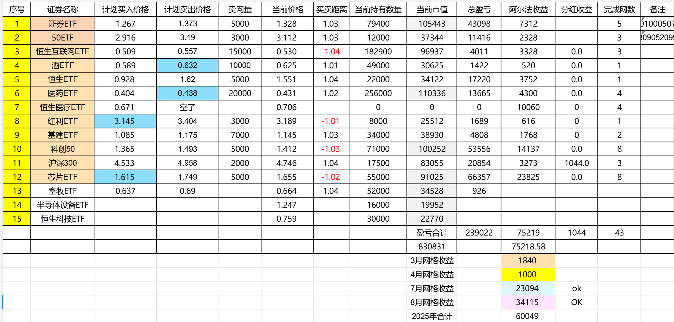 今天终于实现了卖卖卖了,科创50和芯片都连续卖了2网,还分别卖了一网沪深300和上证50,共计6网。8月网格收益来到了2W+;