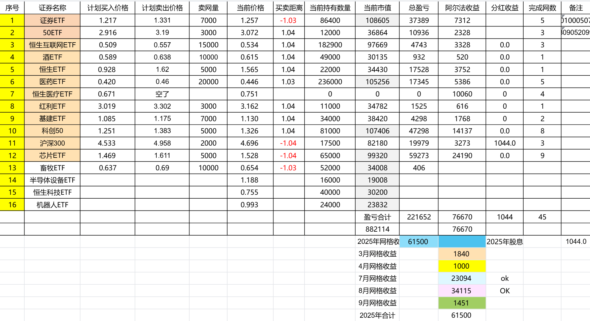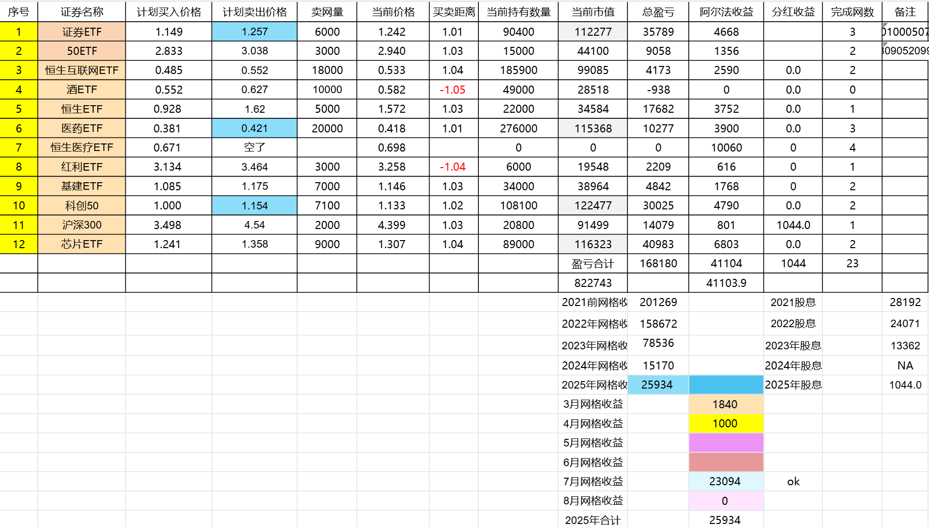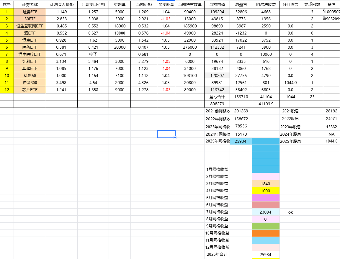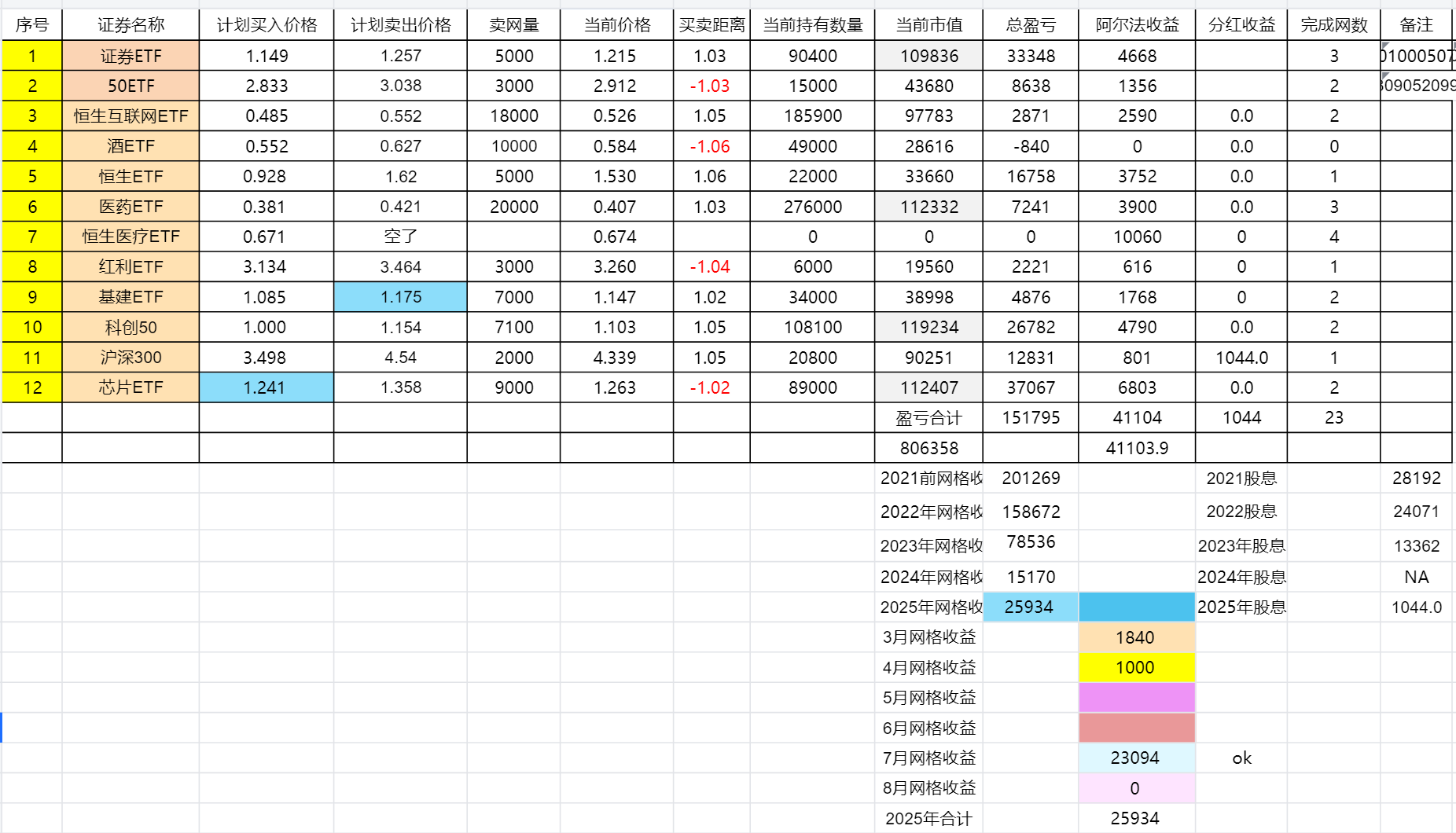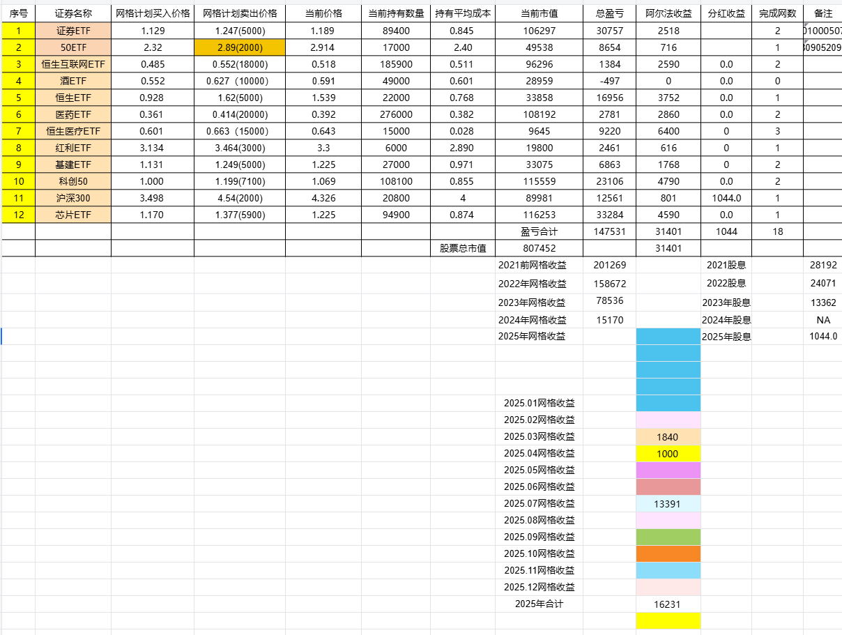 今天终于实现了卖卖卖了,科创50和芯片都连续卖了2网,还分别卖了一网沪深300和上证50,共计6网。8月网格收益来到了2W+;