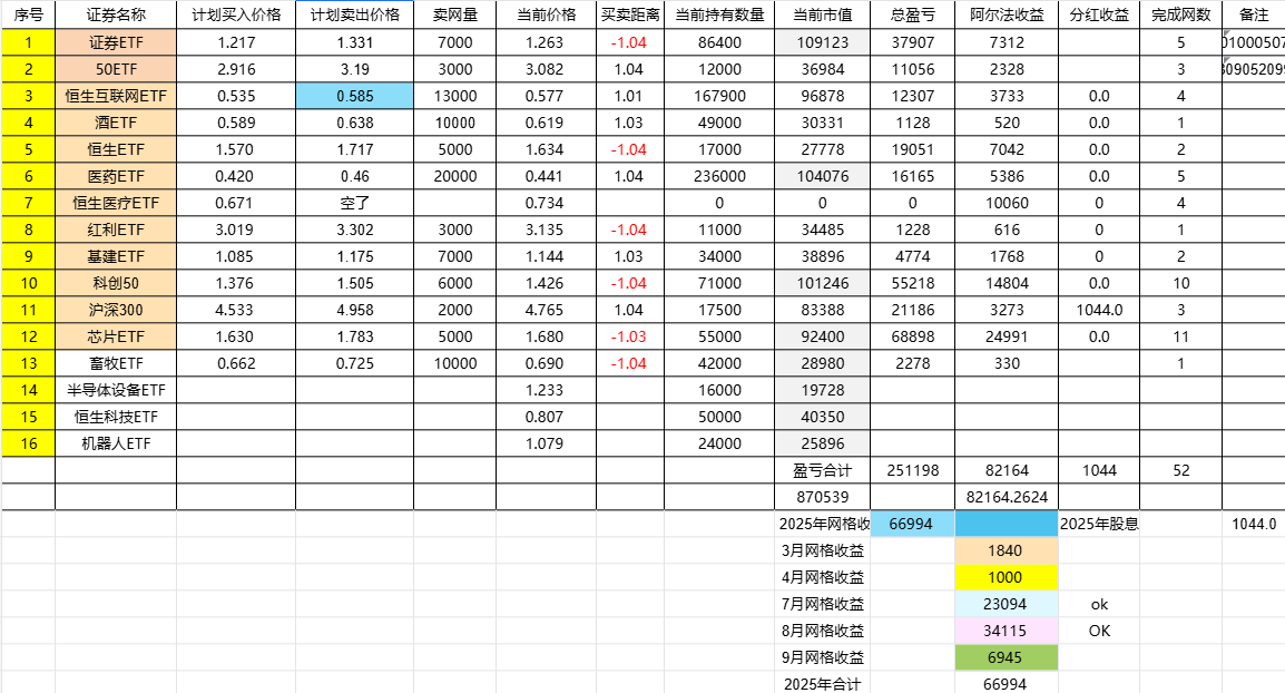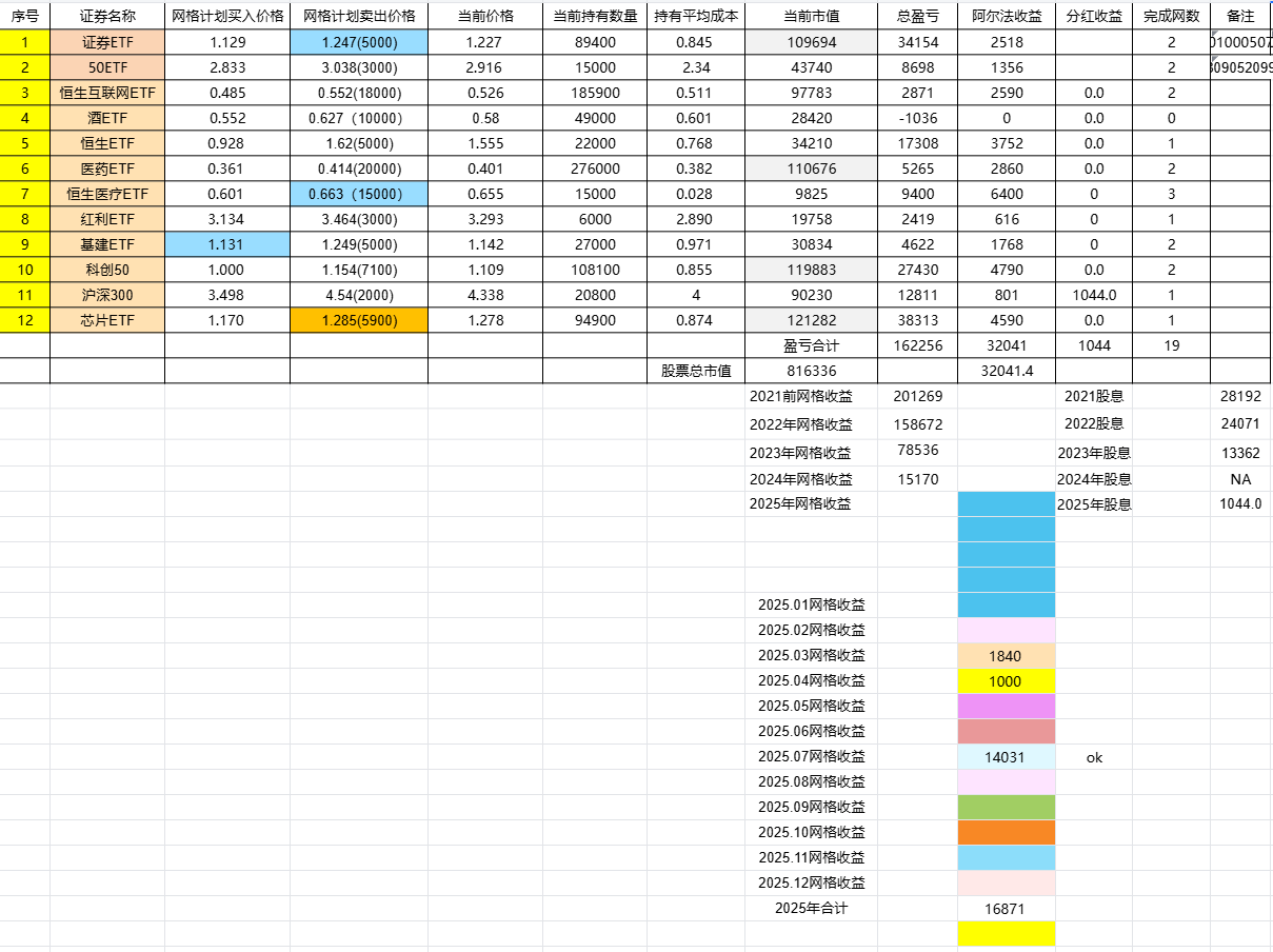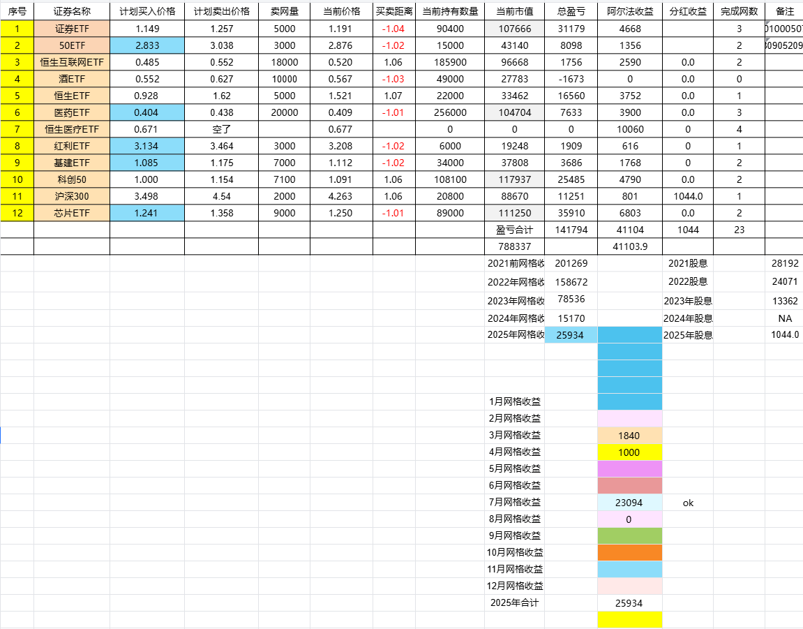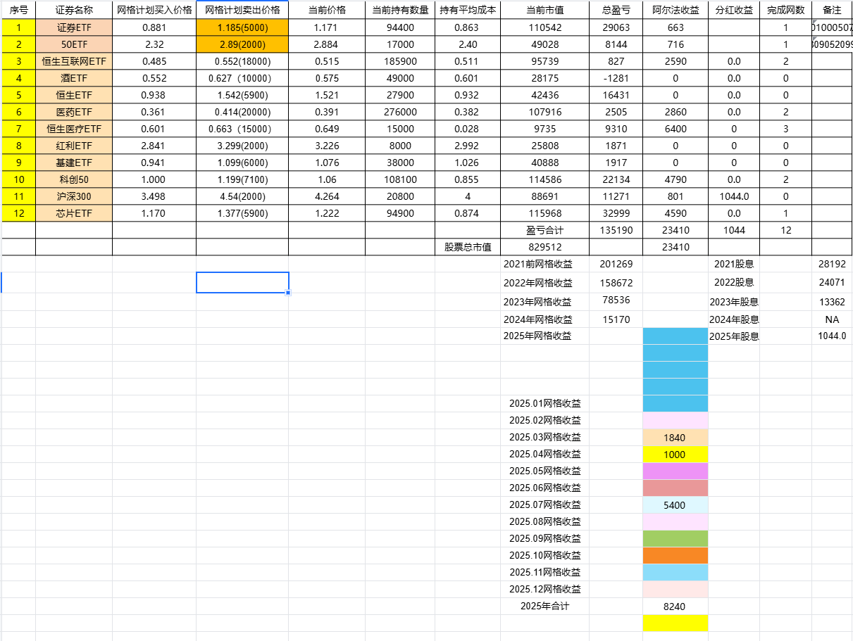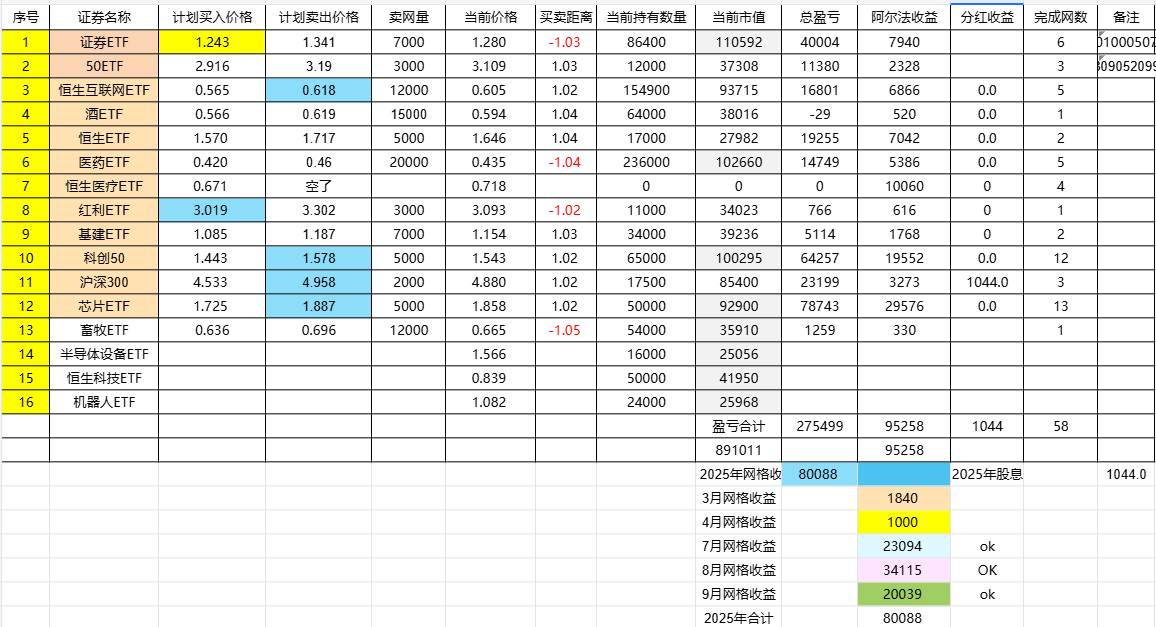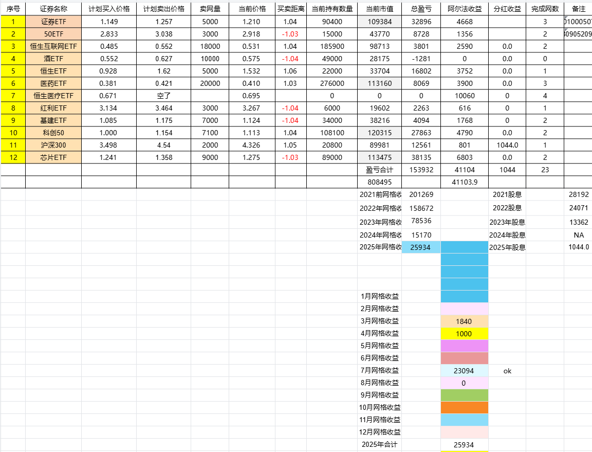 今天终于实现了卖卖卖了,科创50和芯片都连续卖了2网,还分别卖了一网沪深300和上证50,共计6网。8月网格收益来到了2W+;