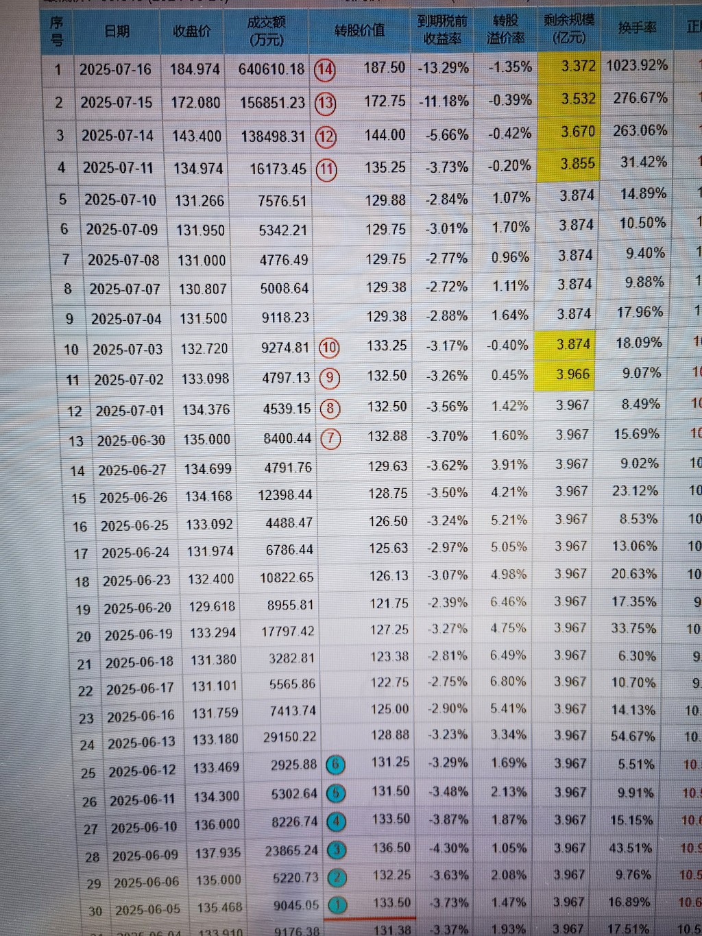 转债指数从前年2月13日2090跌至去年2月5日1753。再到当下2266, 现中位数125.2,温度80.5度,130元以上转债161个,比前日多15个,低于100元2个,比前日持平个,价格创最低0/高9,7月转债6绿6红。可转债成交740亿,比前交易日持平亿,上至700亿第2天。转债指数涨13点,至2266点 ,平均价138.1,比前日高0.6,中位数溢价27%,比前日高0.2,A股成交14619亿,比前日少1600亿,保持持仓 不急不燥。