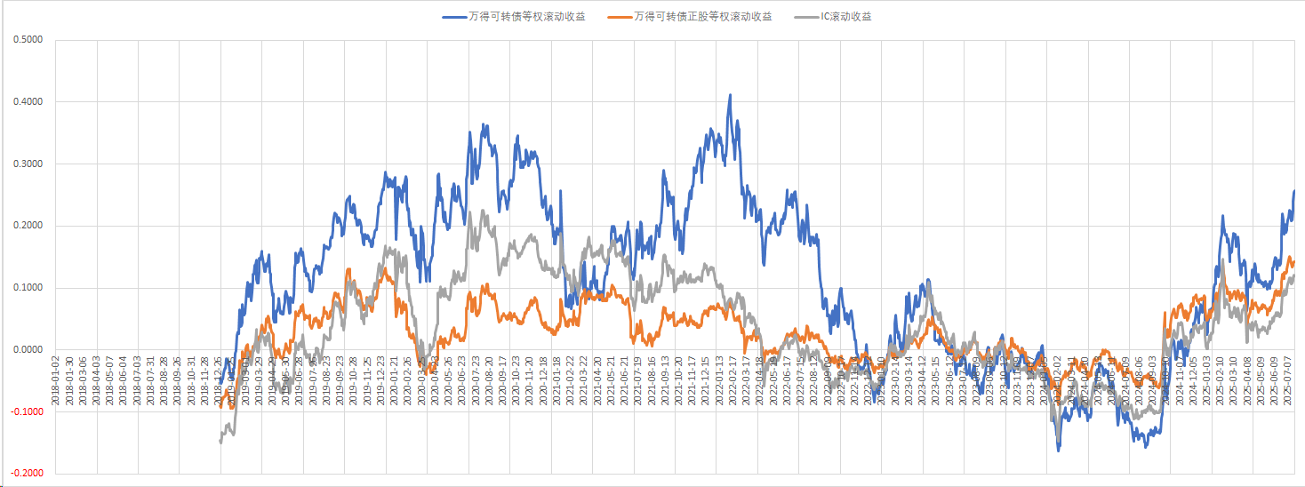 首先是收益方面,按照年度滚动收益来看,可转债在2022年一月是最高峰,后面慢慢收敛到跟另外两个策略持平,然后就是交织缠绕在一起,如果再细分的话,2024年10月之前是跑输的,2024年10月至今又重新略有胜出。就“可转债vs正股”而言,跟泛大的结论基本一致,但IC似乎也没有表现出明显的优势?