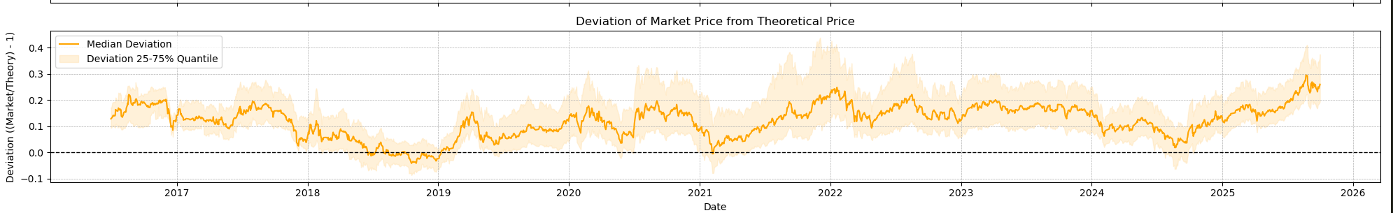 此时,持有可转债会支付大量的“利息”(或被人吃贴水),这个利息是可转债的转股溢价率从某个很高的数字向零收敛带来的。比如在最后一年持有一个转股溢价率为10%的可转债,如果仅考虑股性的部分,就会发现,由于最后大概率转股溢价率会归零。则你需要支付这10%的转股溢价率,就好像在持有一张正基差为10%的股指期货一样(你被别人吃了贴水)。而且你的delta是小于0的,如果股票的delta是0.5,则从100%股票仓位的视角,你支付的贴水甚至达到了年化20%,是非常不合算的。