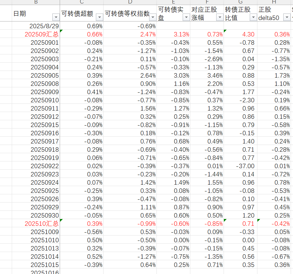 这是最近2个月的实盘记录,从结果看,可转债相比正股还是存在一些优势的。delta按50%算。实盘的策略就是烂大街的轮动。特别是9月份,正股上涨的时候,转债跟随比值几乎都是高于0.85的。