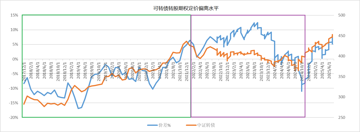 在上图中,我把25年以前的可转债期权定价偏低或定价水平上行(可转债占优)和定价偏高或定价水平下行(可转债劣势,股+债组合占优)分别用绿框和紫框给框出来了。