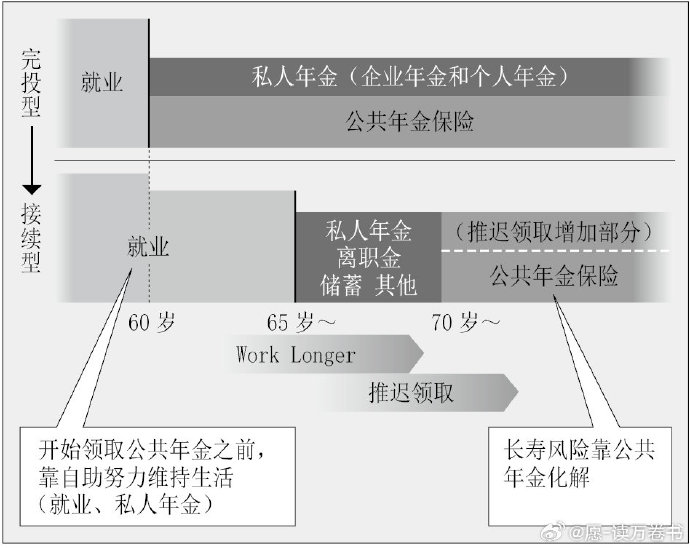 1.“团块世代”活到老干到老。工作时遇到好年代。书中“团块世代”年龄约为70岁左右,找工作时约为1965年左右,适逢“岩户景气”后的高速增长期,坚信“全民皆中产”,入职后终身雇佣,工资因年功序列制稳定增长。退休恰逢延迟退休。随着少子老龄化,总人口减少,老年人口比重持续增长,就业人口规模逐渐缩小,为缓解劳动力短缺、延长劳动者缴费年限、增加养老保险基金收入,日本政府《高龄者雇佣安定法》于1986年首次将退休年龄从55岁延至60岁,2004年启动65岁退休分阶段实施计划,2013年全面完成65岁退休制度覆盖,2021年进一步提出“70岁退休愿景”。被动就业与主动就业。日本男女平均寿命均已突破80岁,储蓄和养老金不够用的老人被动就业,从而赚足家庭养老金缺口2000万日元(约100万人民币)(摘自日本金融厅报告《老龄社会下的资产形成与管理》)。主动就业则是源自于老年人的社交需求。