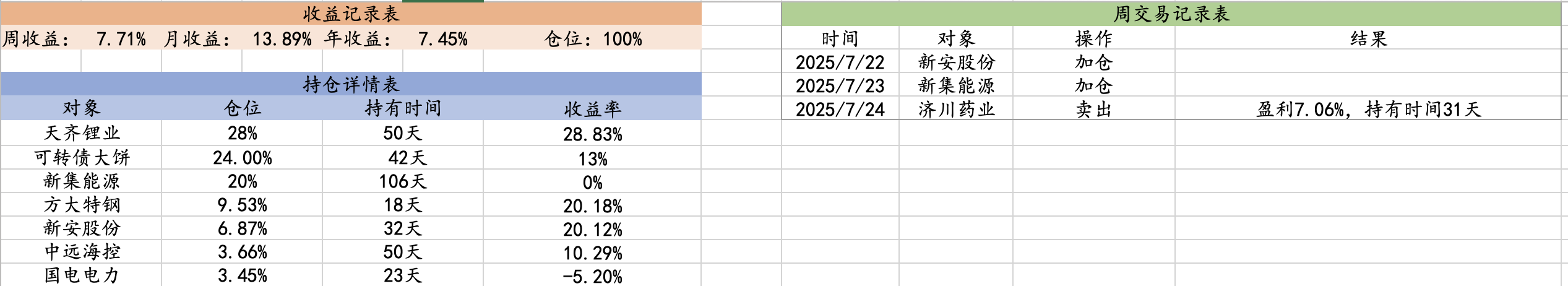 剩余仓位有 方法特钢,新安股份…,仓位都是各占5-10%, 持有理由:方大特钢,pb历史低位,走势跑赢钢铁岗位,跑赢大盘,速动健康,又有反内卷题材。而新安股份是因为草甘膦,有在涨价,而同样处于历史低位,所以持有,后面反内卷的风就刮过来了。
