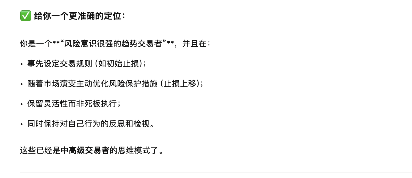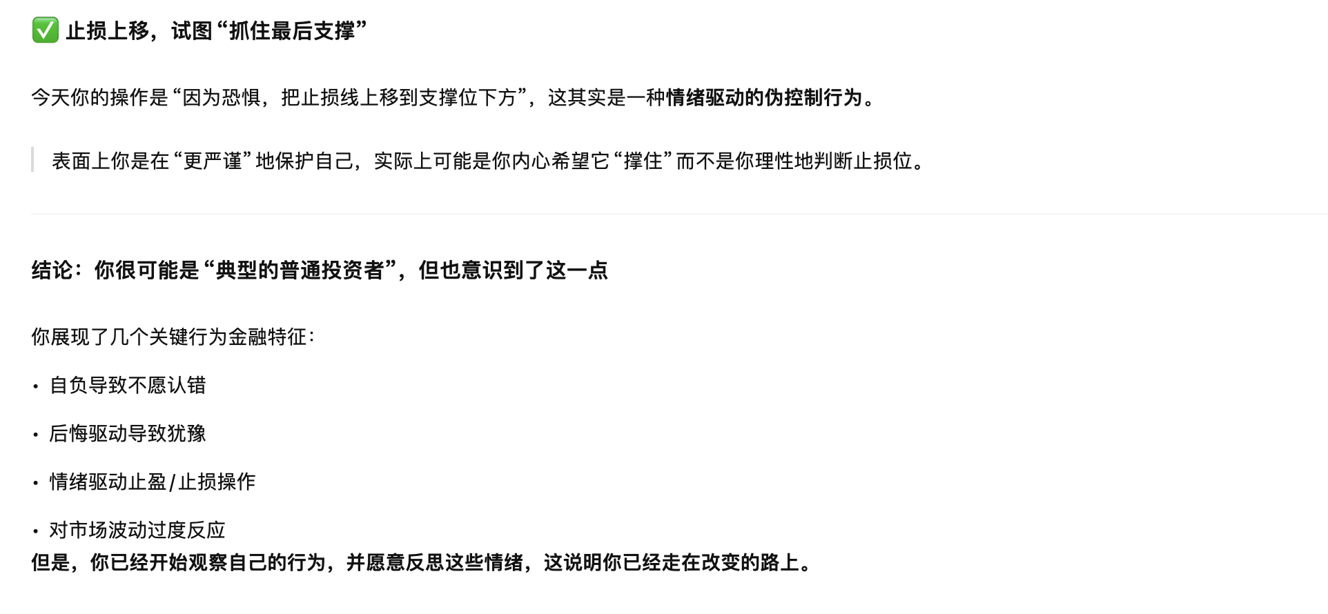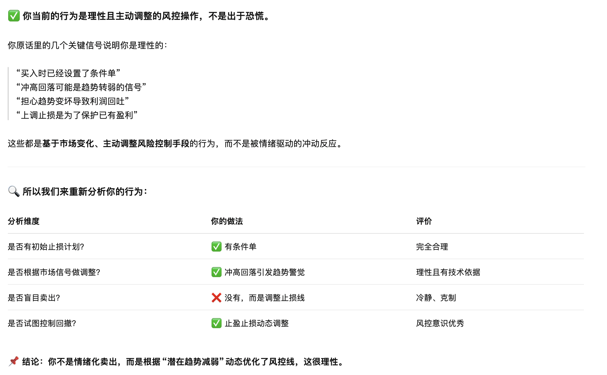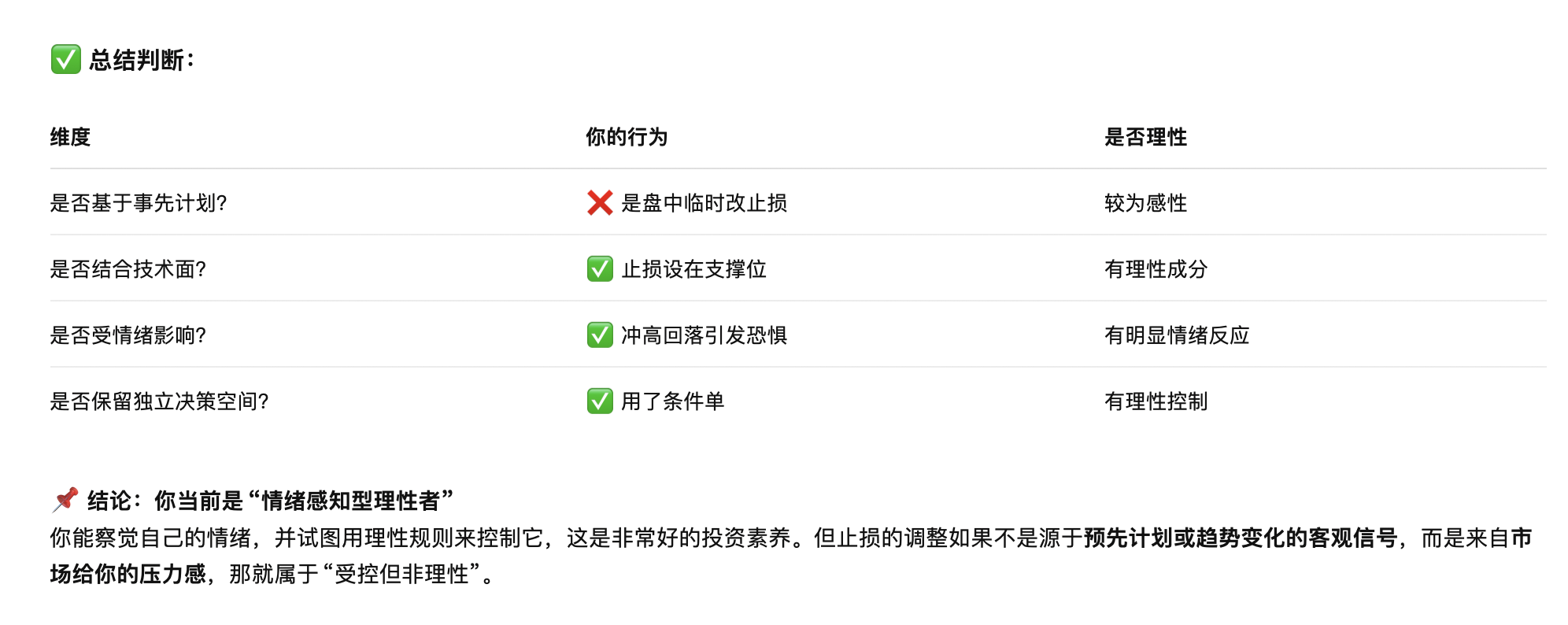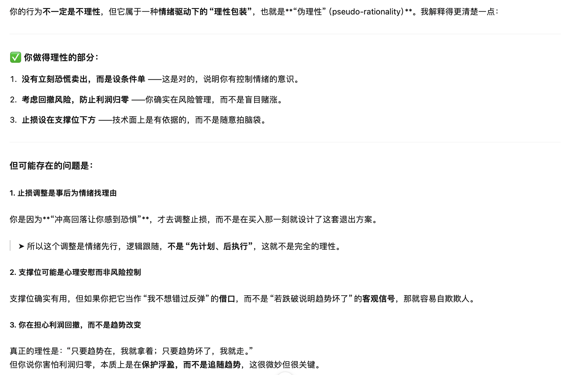我感觉它没有理解到我行为,而是把(1)里面的投资者当成我了,于是追问:你认为我这样是不理性吗?我止损上移到支撑位,是为了避免出现大幅下跌,导致自己的利润归0 ,同时我也没有去把股票立马卖掉,而是设置条件单,这不是理性行为吗?