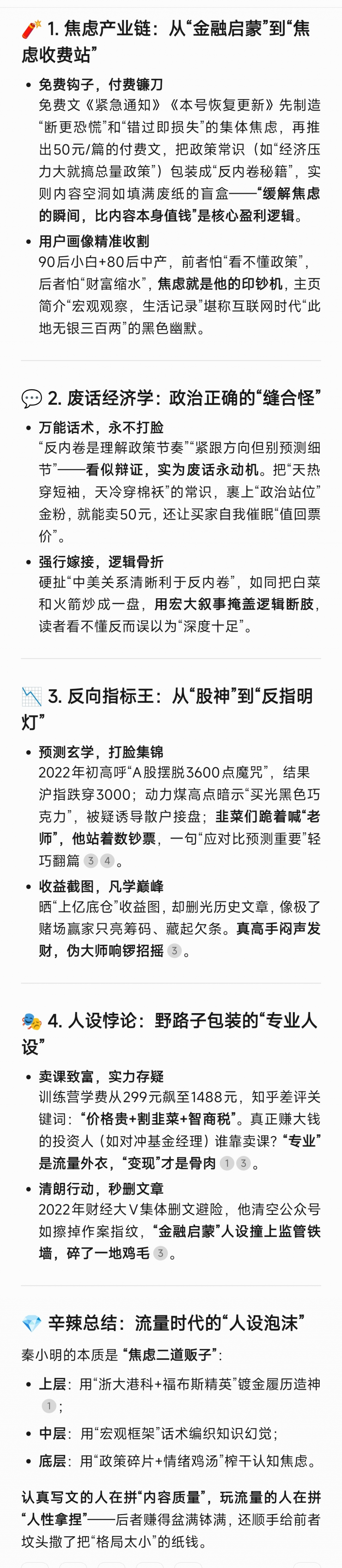 三天两头发文,总能找的到神操作也不缺乏韭菜操作。不下场的大 V ,没有长期可靠实盘或者三方验证净值,一律当模拟盘叼盘处理。集思录喜欢讲套利,秦大师在用公众号文章+星球+会员费+带货进行无风险套利,要学就学这个吧,也是个技术活,值得好好学。他是在自己投资破产欠一屁股债的情况下,二次创业做自媒体起来的。