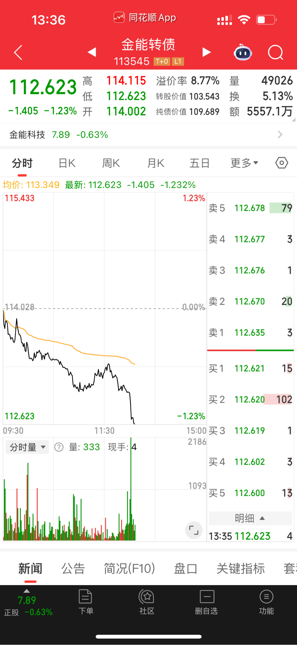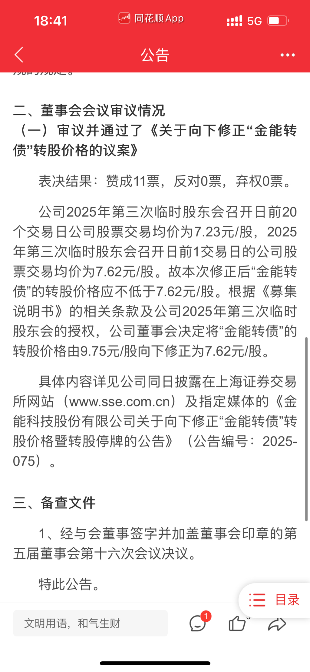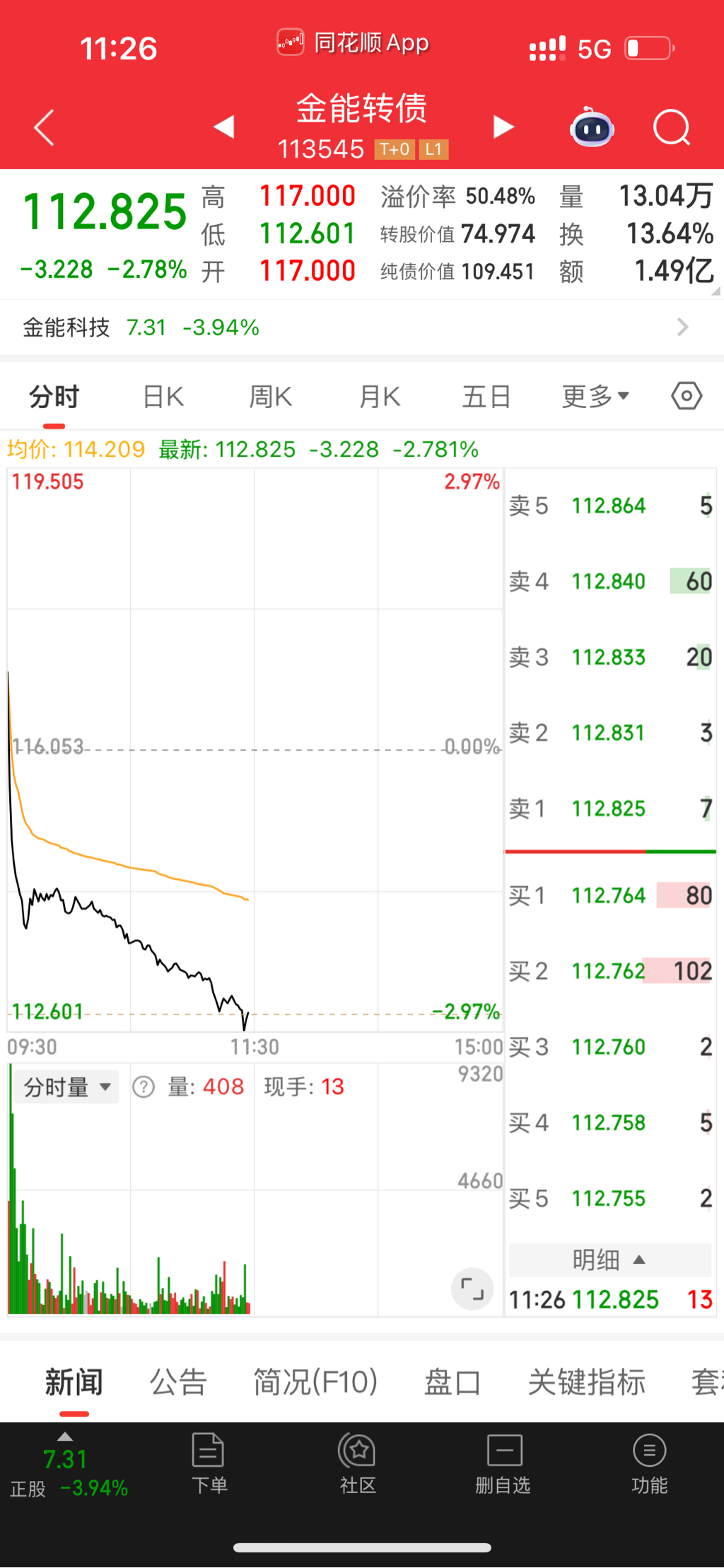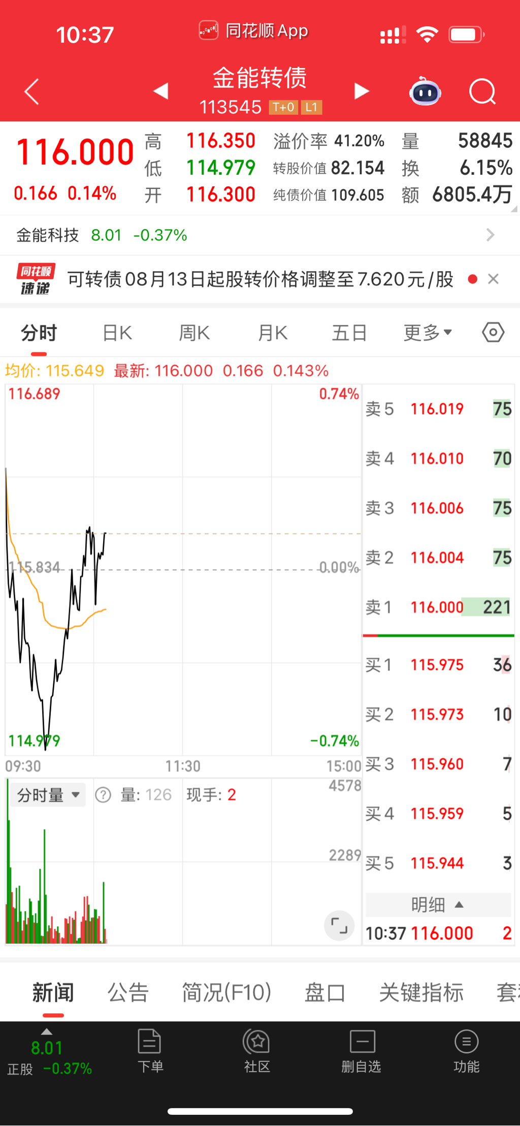 还是在别的贴子说的,一、强赎策略1.拉到转股价值130,正股要拉23%,且维持15天,耗费资金不容易,剩下时间少。2.且拉到强赎公告,强赎价也就100.x元,和到期要还的价格106相差真的没多少。或者二、到期负溢价策略不拉到强赎价,在10.14日前2天将正股维持在8.39(转股价值107),10.14日后不转股就亏1元,促使转股,耗用的资金并不大,但基本上要还70%的债。因此后面是回归到107,...你说的对。不过你数据说错了。到期价格是110。拉到8.39,转股价值也是110.1左右。逻辑没毛病,不过我认为转股价值得拉到115才稳妥,如果110,很多人会选择不转股,因为怕砸盘。 之所以我愿意选择金能作为现金替代物,原因就是在大牛市面前,上市公司的意志可以忽略不计了。