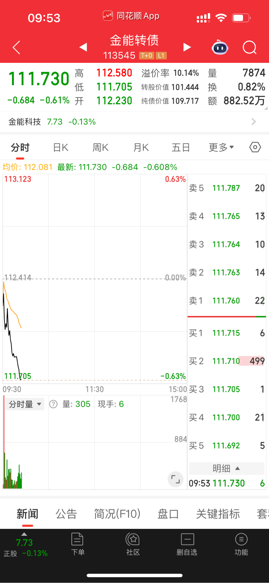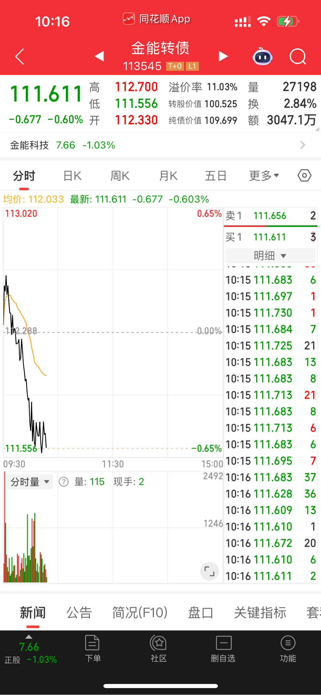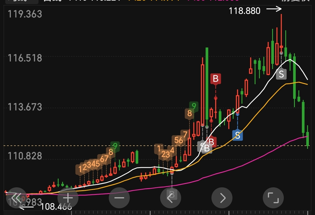 尾盘112.8-11.9左右,今天加的几乎都卖掉了,赚了1%多点。等跌下去再买,牛市的资金太宝贵了,不然我会继续持有。