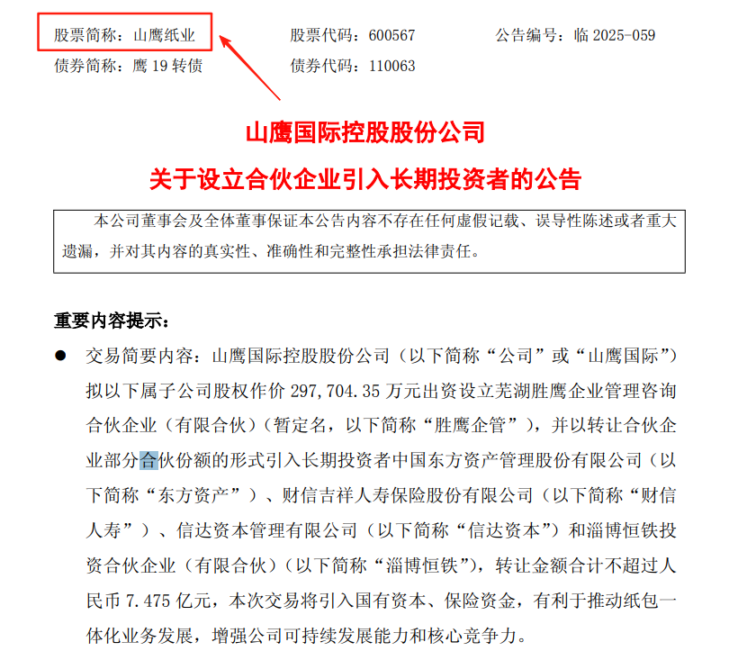 山鹰国际控股股份公司拟以下属子公司股权作价 297,704.35 万元出资设立芜湖胜鹰企业管理咨询合伙企业(有限合伙)(暂定名,以下简称“胜鹰企管”),并以转让合伙企业部分合伙份额的形式式引入长期投资者中国东方资产管理股份有限公司(以下简称“东方资产”)、财信吉祥人寿保险股份有限公司(以下简称“财信人寿”)、信达资本管理有限公司(以下简称“信达资本”)和淄博恒铁投资合伙企业(有限合伙(以下简称“淄博恒铁”),转让金额合计不超过人民币 7.475 亿元,本次交易将引入国有资本、保险资金,有利于推动纸包一体化业务发展,增强公司可持续发展能力和核心竞争力。