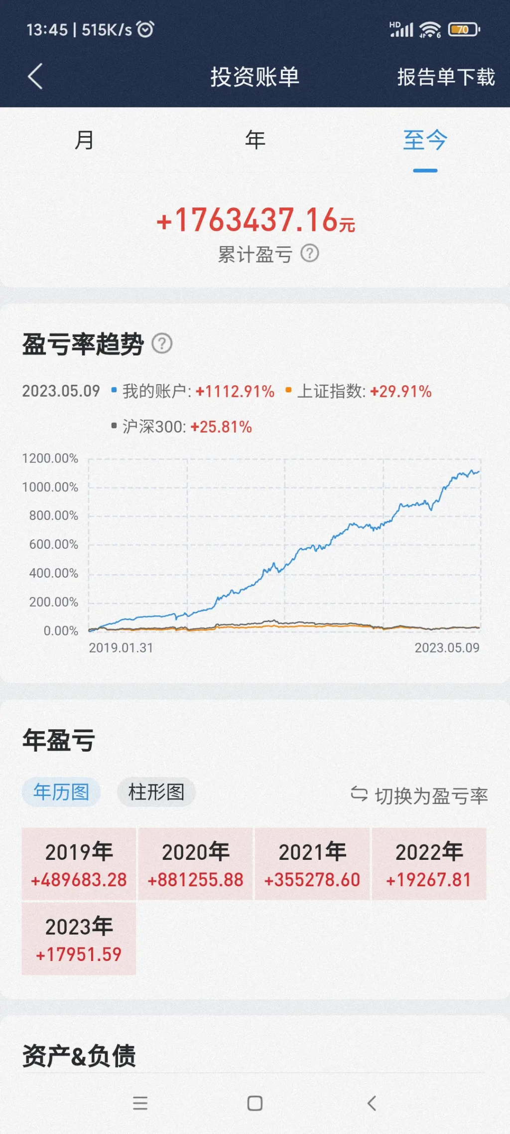 19-21年搞消费ETF,50万变200多万。然后最近这3年,依旧重仓持有消费,消费指数从最高点跌了40%,我天天操作消费也不过没亏而已。回头再看只是运气好,站在风口上了。2022-2025如果赚钱,可能持有可转债,黄金石油,红利银行,新消费,创新药,纳斯达克科技。因为换融资账户,这个融资账户已经销户了,所以收益率曲线只到2023年5月。一切从0开始。