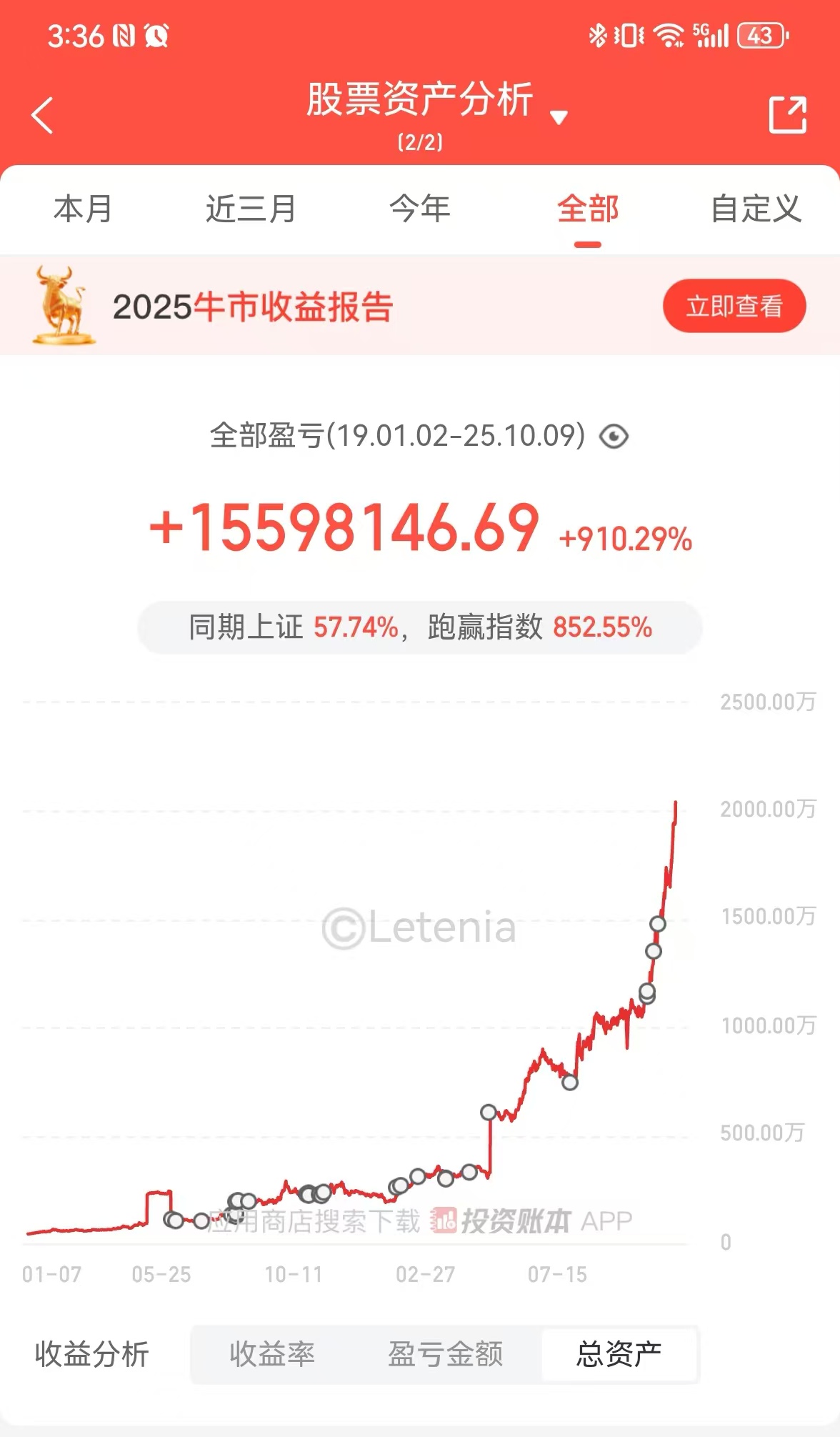 4、投资上我也不敢说能力,主要还是运气吧。19年以来我整体的收益率自己还是能认清的,在做好最坏预期的心理测试后,还是选择相信自己,自助者天助。而且我妻子在投资这块是无条件相信我的,也解除了我的后顾之忧。