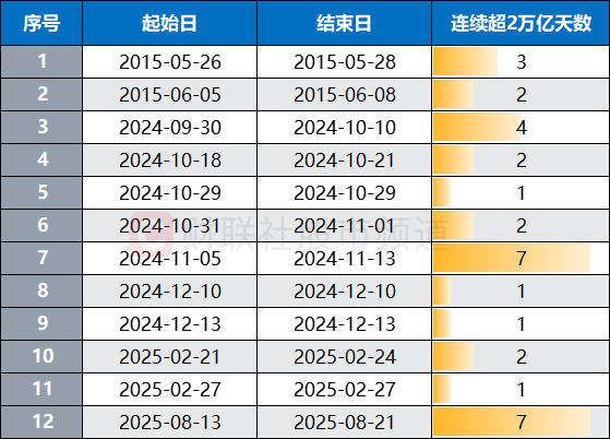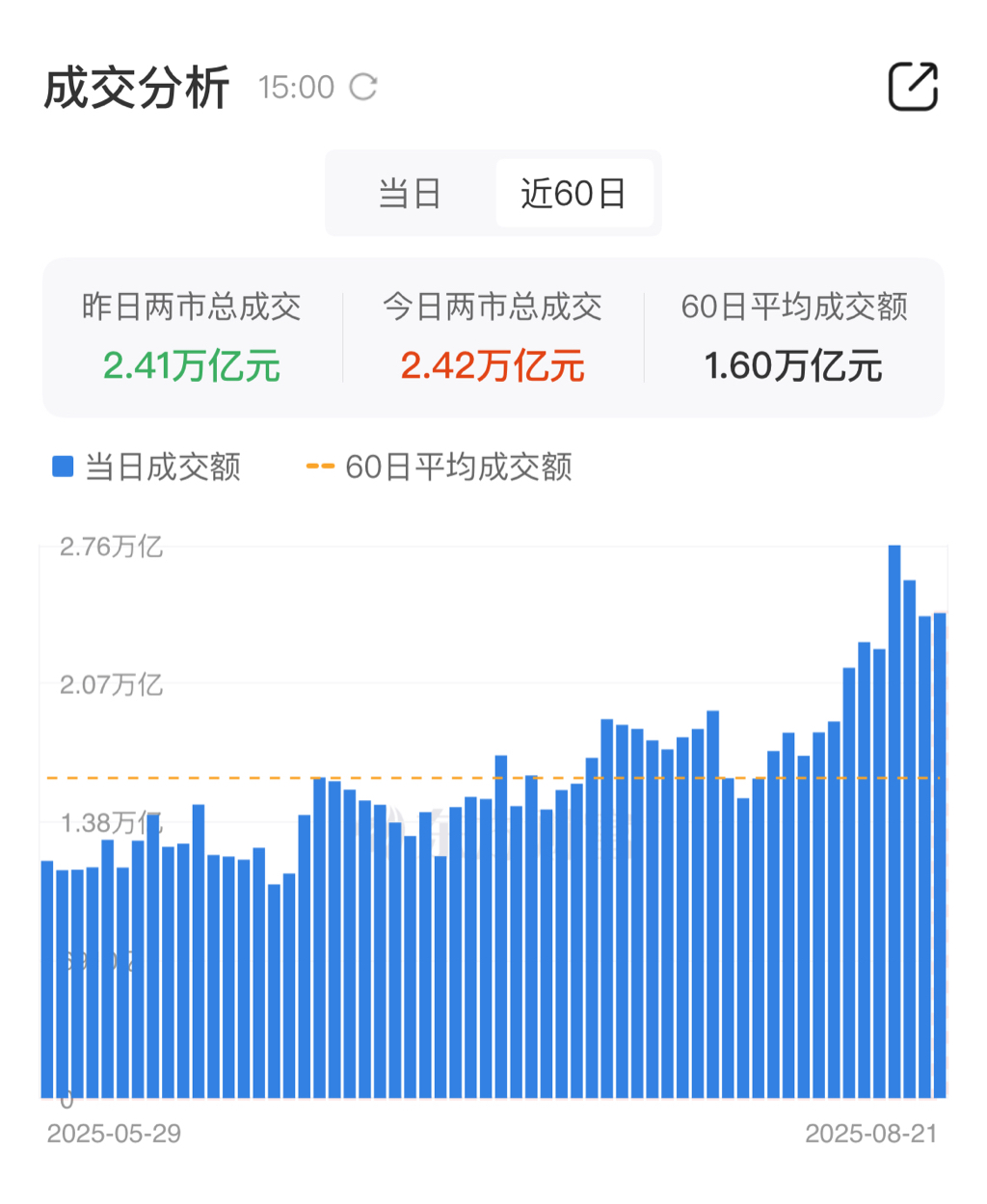 转:今日(8月21日),市场交易热情不减,截至收盘,沪深京三市成交额2.46万亿元,为连续第7个交易日突破2万亿大关,上一次类似这样的巨量行情还要追溯至去年11月。彼时,在2024年11月5日至13日期间,A股成交额连续7日超2万亿,创当时的历史纪录。