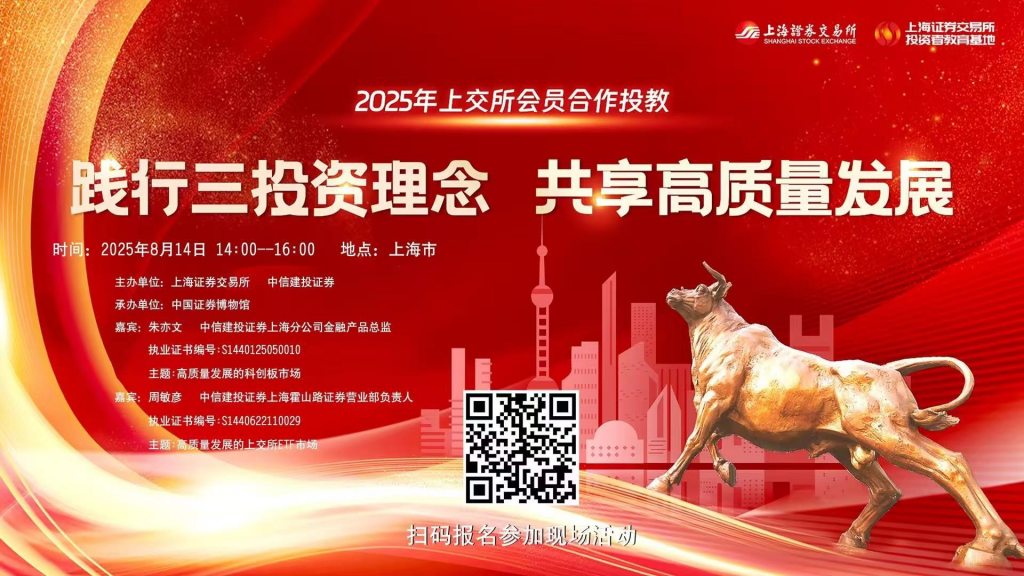 2025年8月14日(本周四),下午14:00-16:00,由上海证券交易所、中信建投证券主办,中国证券博物馆承办的2025年上交所会员合作投教活动将在上海举行。欢迎大家扫码报名!!