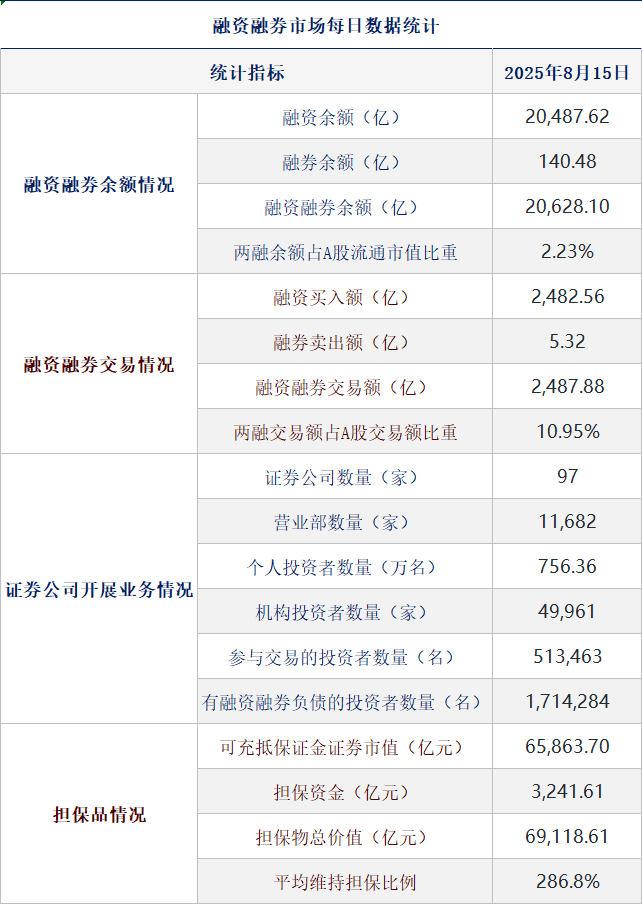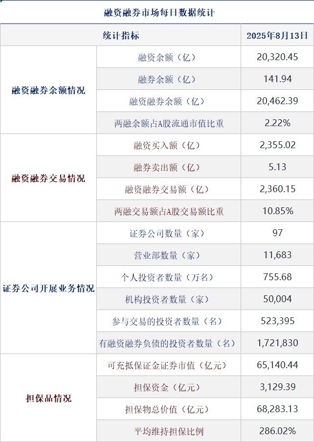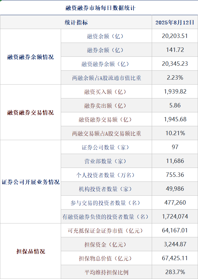 2025年8月11日融资余额20,121.88亿元,两融余额占A股流通市值比重2.23%;融资融券交易额1,956.58亿元,两融交易额占A股交易额比重10.58%。
