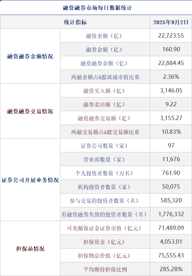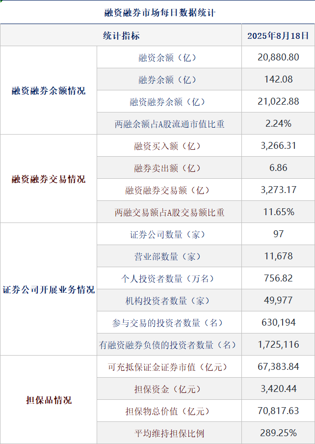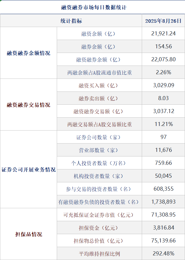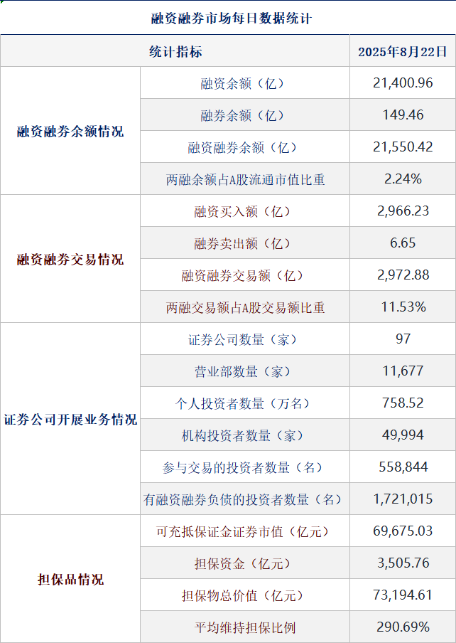 2025年8月25日融资余额21,729.37亿元,两融余额占A股流通市值比重2.24%;融资融券交易额3,749.35亿元,两融交易额占A股交易额比重11.80%。