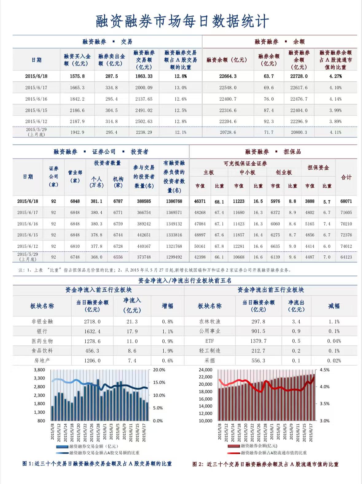 2015年6月18日融资余额22,664.3亿元,两融余额占A股流通市值比重4.27%;融资融券交易额1,863.33亿元,两融交易额占A股交易额比重12.8%。