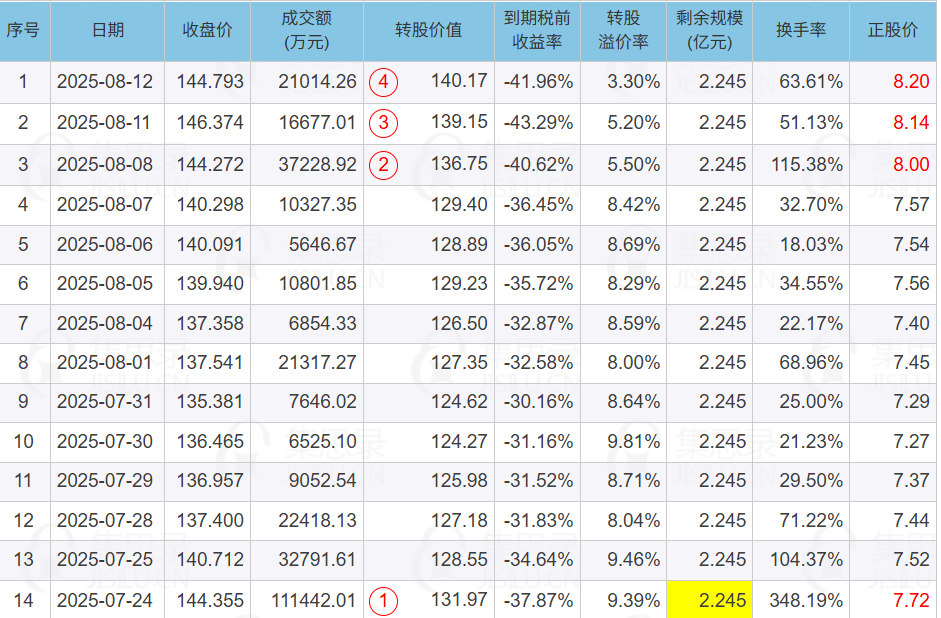现状:宏辉转债(136365),8月12日收盘价144.793( -1.08%),转股价值140.17(4/15),正股收盘价8.20(+0.74%),溢价率3.3%,剩余规模2.245亿元,剩余年限0.543年,最近转股了了无几。