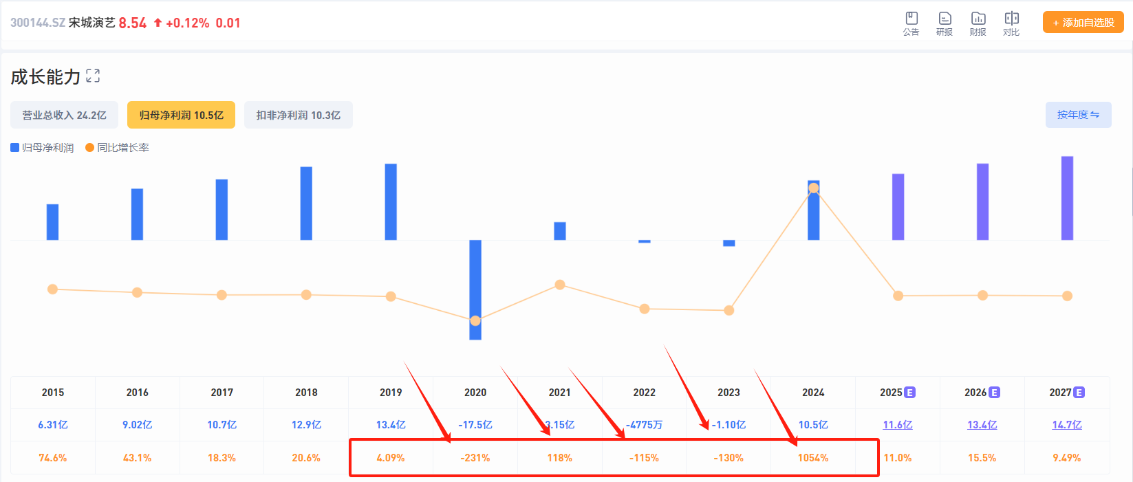 2018年利润增长率只有4%。这都还是好的。然后的年份,利润增长率经常正一百、负一百地大幅波动,甚至还有1054%。