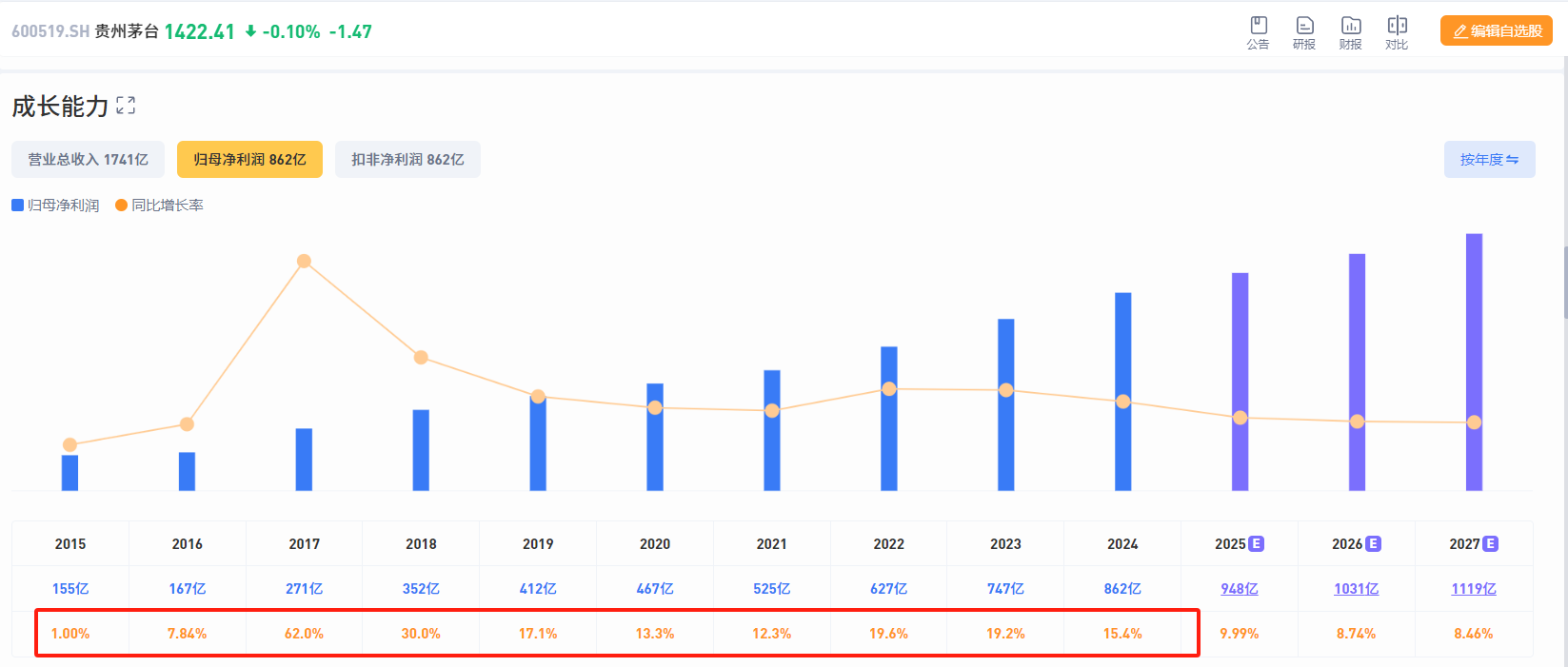 茅台过去10年,利润增长率最高62.0%! 其他时间常年保持在2位数。