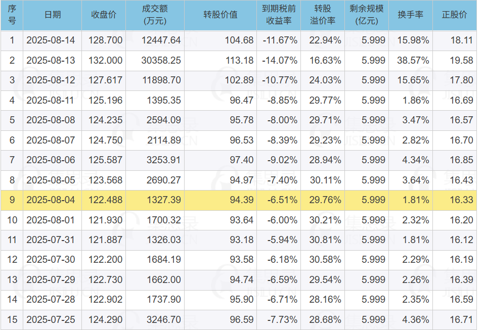 现状:弘亚转债 127041,8月14日收盘价128.700 -2.50%,转股价值104.68(0/15),正股收盘价18.11 -7.51%(13号涨停),溢价率22.94%,发行规模(亿元):6.000,剩余规模(亿元):5.999,剩余年限0.910年,最近几年无转股。